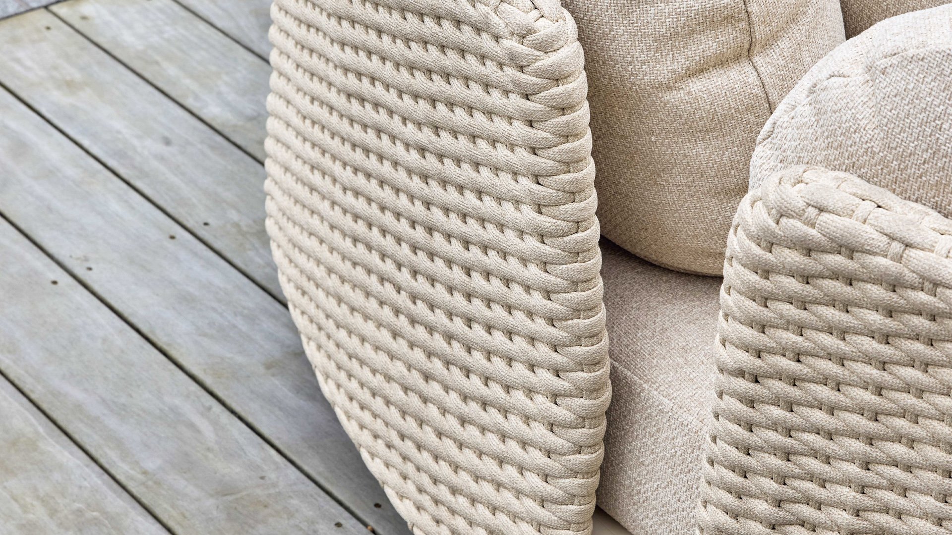 Dieses wunderschöne Material eignet sich perfekt für den Außenbereich, denn AppleBee Rope ist nicht nur eine normale Spitze, an der Sie Ihre Schuhe binden können. AppleBee verwendet ein sehr hochwertiges Faser aus 100% SDP (Slution Dyed Polypropylen). Dieses Material ist extrem stark und hat einen sehr geringen Stretchanteil. Polypropylen ist auf Ölbasis, so dass Schmutz und Verunreinigungen, genau wie unsere Kissen, kaum eindringen können. AppleBee bietet exklusive Designs mit handgeflochtenen Geflechtmustern und -techniken.