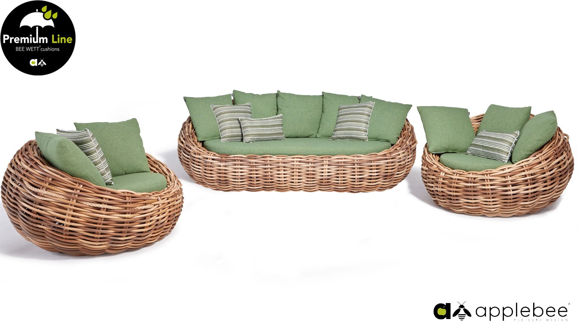 Applebee Cocoon ist inspiriert durch den sicheren Kokon, in dem sich eine Raupe geborgen fühlt und sich in einen wunderschönen Schmetterling verwandelt. Wunderschöne grüne Loungekissen – optional mit Bee-Wett®-Technologie – in Kombination mit dem außergewöhnlich dicken geflochtenen Biculair®-Flechtfaden in 20mm Stärke.