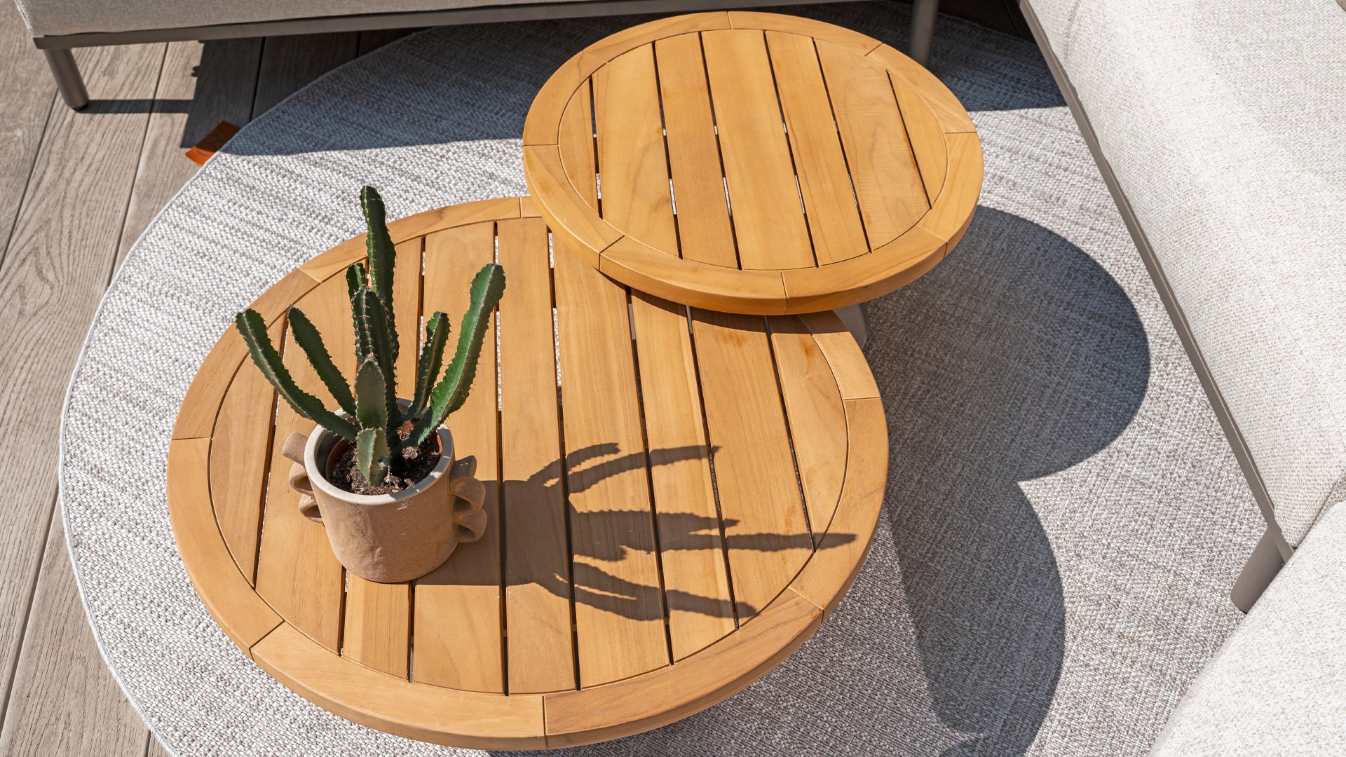Entdecken Sie die Schönheit und Vielseitigkeit des runden Couchtischs 4 Seasons Outdoor Volta mit seiner wunderschönen Teakholz-Tischplatte und dem Edelstahlrahmen. Die Tischserie Volta besteht aus 3 Größen und 3 Farben Anthrazit, Weiß, Latte. Dieser Tisch verleiht Ihrem Außenbereich einen Hauch natürlicher Eleganz und wurde mit Liebe zum Detail entworfen.