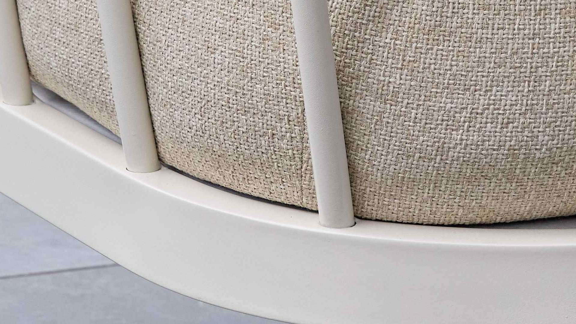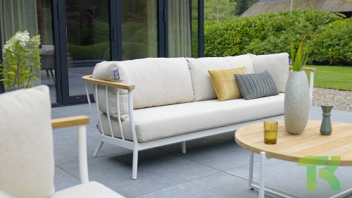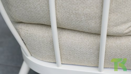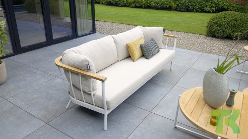 Die Apple Bee Condor Lounge Oyster hat ein klares, robustes Aussehen. Das Basismaterial ist Oyster-farbenes pulverbeschichtetes Aluminium. Die BEE WETT® Kissen haben eine grobe Webstruktur, aber mit einem weichen Griff. Die schönen Rundungen im Rücken und die Verwendung von naturbelassenem Teakholz in den Armlehnen verleihen dem Condor eine angenehme Prise natürliche Wärme.