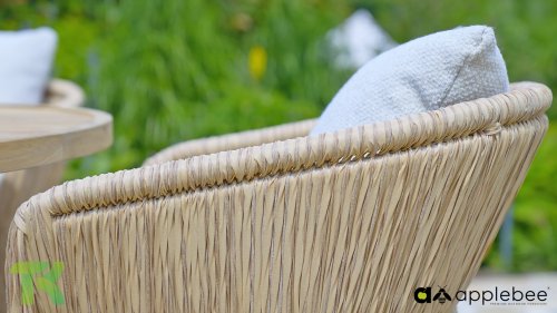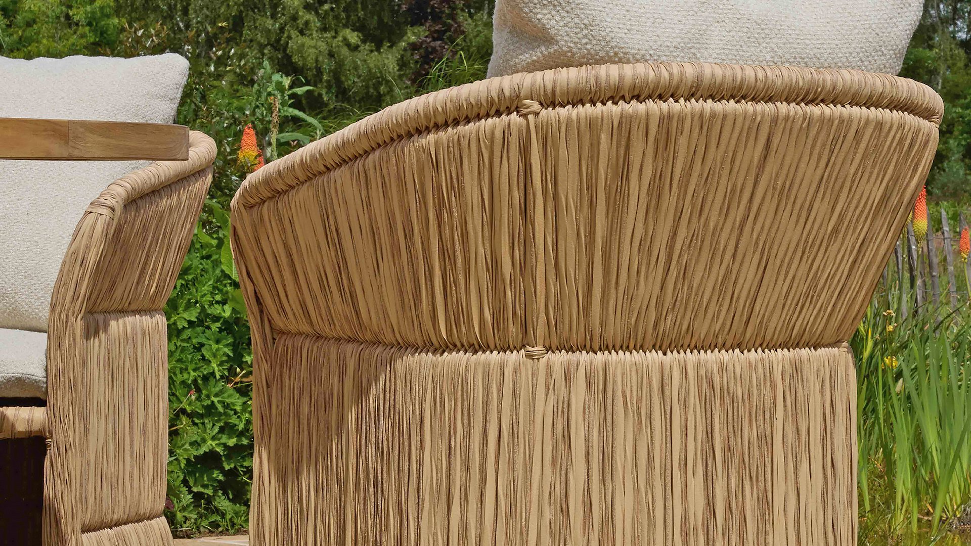 Das Geheimnis des Gili liegt in seinem Material: Biculair-Geflecht. Dieses dicke, runde Flechtwerk in einem warmen, natürlichen Farbton verleiht dem Stuhl eine authentische Flechtoptik und ist gleichzeitig absolut wetterfest. Der Stuhl ist als bequeme Schale mit einem dicht geflochtenen Gestell konzipiert und verleiht dem Gartentisch ein solides und edles Aussehen.