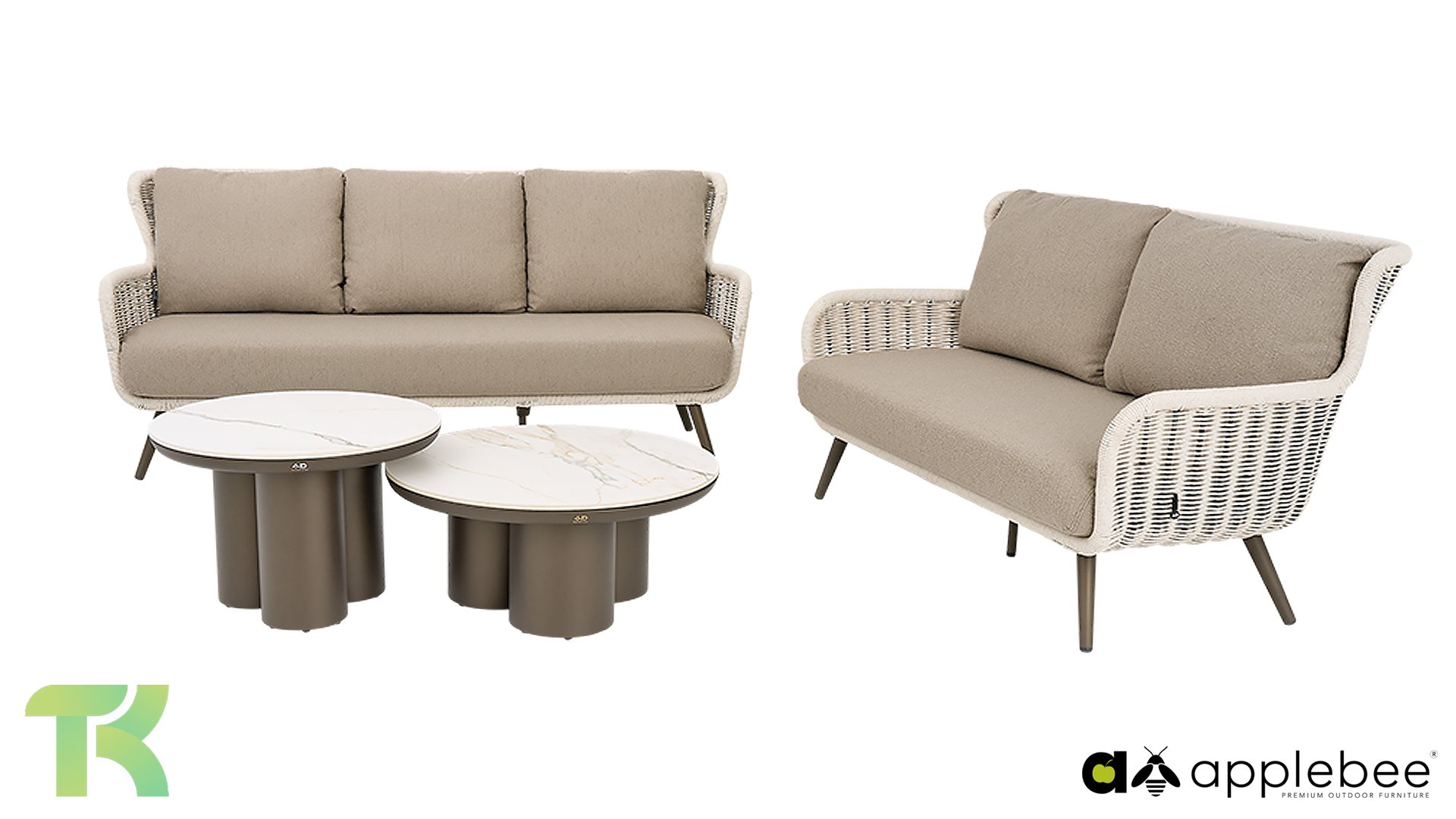 Raffiniertes Design mit Charakter. Die Apple Bee Key Largo Lounge besticht durch ihre wunderschönen Kontraste. Das pulverbeschichtete Aluminiumgestell in elegantem Bronze bildet eine stabile und zugleich elegante Basis. Dazu passt das edle Biculair®-Geflecht in Elfenbein. Der Biculair®-Draht ist in einer einzigen, nahtlosen, geschwungenen Linie bis zur Sitzfläche geflochten. Dieses Geflecht, das an luxuriöses Seil erinnert, verleiht dem Set einen rustikalen, bohemischen Charme, der in jedem Garten eine gute Figur macht.