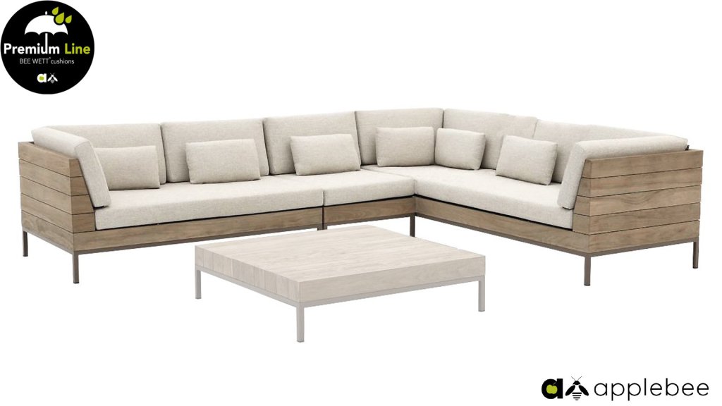 Die Apple Bee Long Island Lounge ist modular und geeignet für große und kleine Konfigurationen. Das Teakholz ist mit einer Coastal-Farbfinish behandelt. Die klaren Linien sind charakteristisch für das Aussehen dieses schönen Sets. Der grob gewebte Stoff verleiht dem Set ein luxuriöses Aussehen und bringt eine Strandatmosphäre in Ihren Garten!