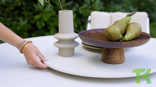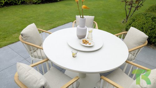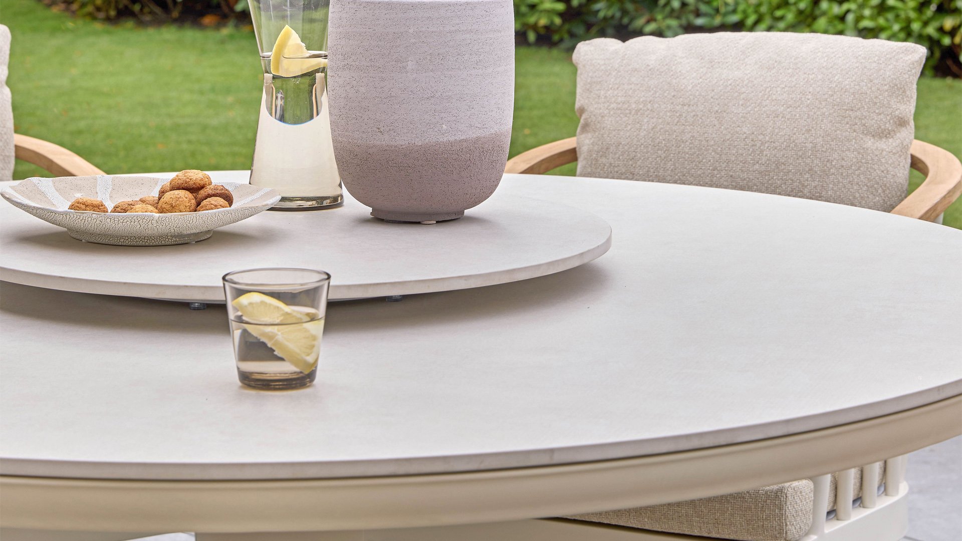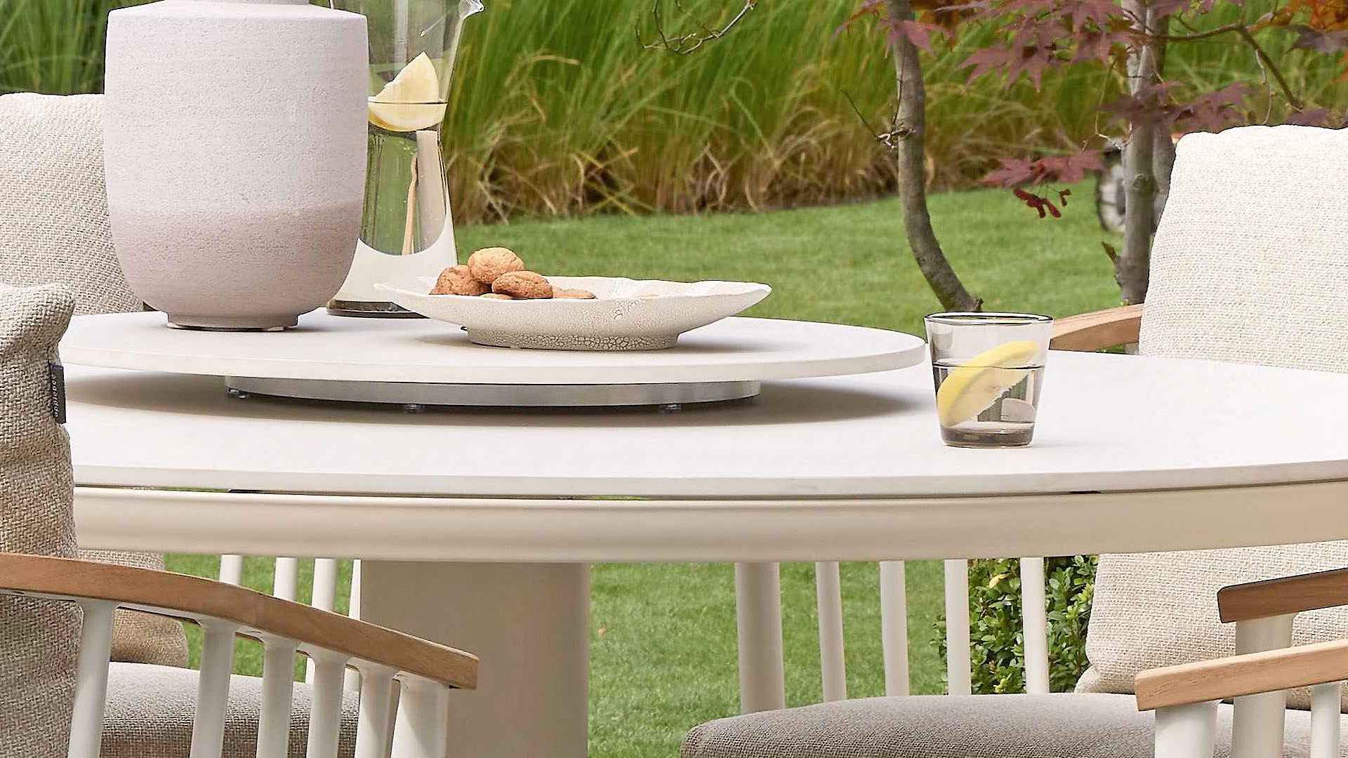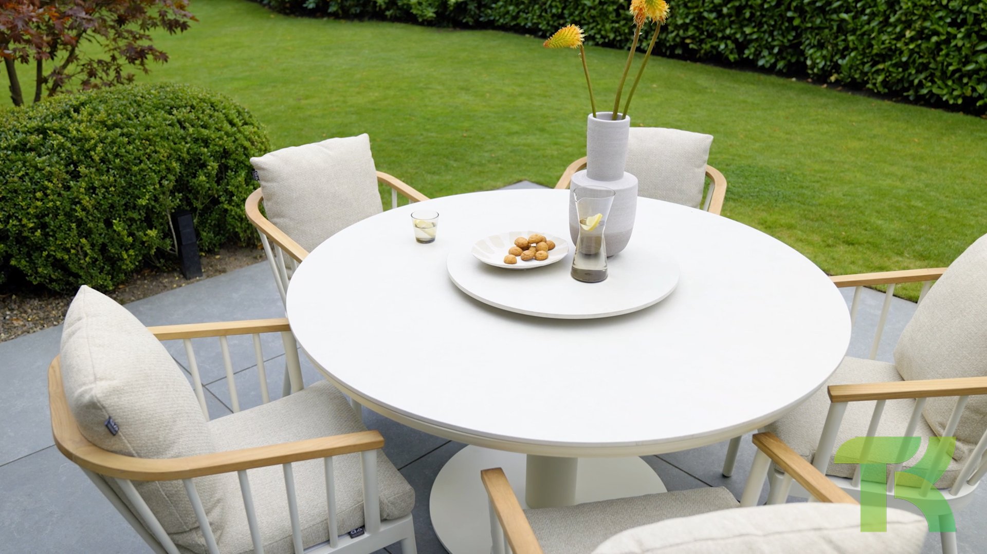Dieser elegante Apple Bee Tisch vereint luxuriöses Design mit unvergleichlicher Langlebigkeit. Die Tischplatte ist aus Sinterstein gefertigt – einem hochwertigen Stein, der kratz-, flecken-, hitze- und UV-beständig ist. Perfekt für den intensiven Einsatz im Freien, ohne Kompromisse beim Stil einzugehen. Das robuste, pulverbeschichtete Stahlgestell verleiht dem Melville einen modernen und eleganten Look und sorgt gleichzeitig für maximale Stabilität. Für noch mehr Eleganz ist auch ein Lazy Susan Drehteller Ø60cm erhältlich!