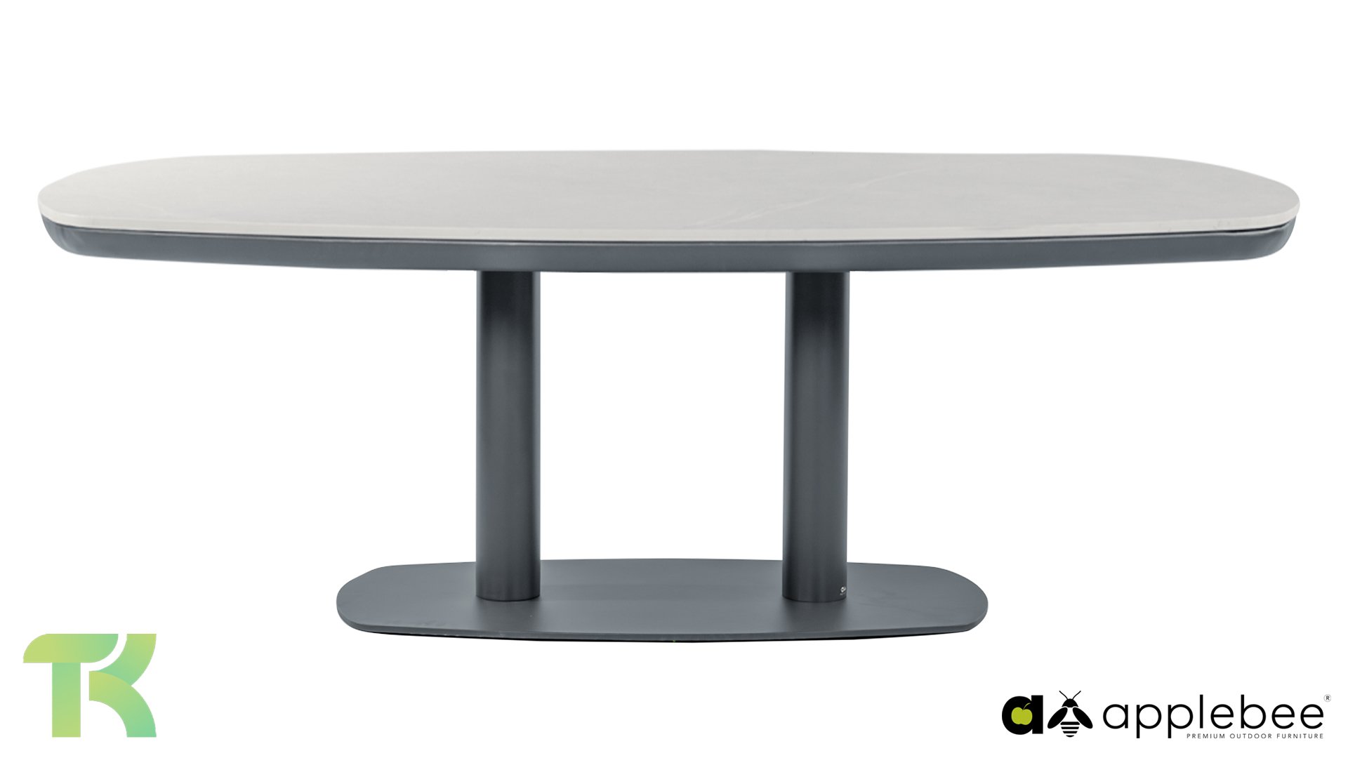 Der Esstisch Melville von Apple Bee ist das ultimative Meisterstück für Garten oder Terrasse. Der absolute Blickfang ist die Tischplatte aus hochmodernem Sinterstein. Dieses innovative Material ist nicht nur wunderschön anzusehen, sondern bietet auch höchste Funktionalität: Es ist außergewöhnlich kratz-, flecken- und hitzebeständig und somit ideal für intensive Nutzung und unbeschwertes Leben im Freien. Das Premium-Design ruht auf einem eleganten und dennoch extrem stabilen, pulverbeschichteten Aluminiumgestell.
