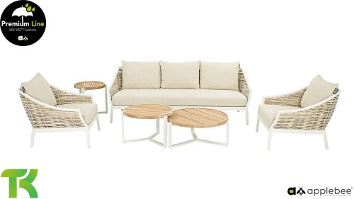 Die Apple Bee Milou Lounge Oyster besticht durch ihre elegante Flechtoptik und verleiht Ihrer Lounge-Garnitur eine natürliche Note! Sie bietet großzügigen Sitzkomfort und dicke Kissen mit Apple Bees bewährter Bee Wett®-Technologie. Das Gestell besteht aus pulverbeschichtetem Aluminium in Austernfarbe, kombiniert mit robustem Biculair-Flechtgeflecht. Dieses Flechtgeflecht wird von einem ebenfalls pulverbeschichteten Rahmen in Austernfarbe mit geschwungenen Linien eingefasst, was der Milou ihren schicken, modernen Look verleiht.