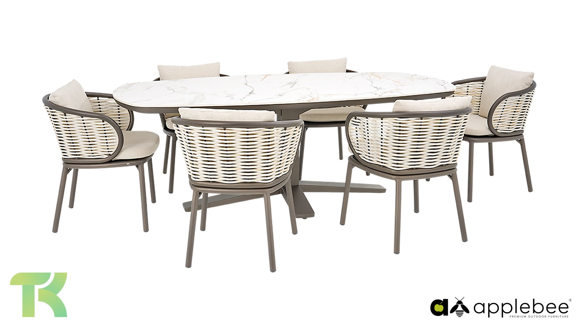 Verschönern Sie Ihren Außenbereich mit dem Gartentisch Zanzibar von Apple Bee – ein Paradebeispiel für modernes Design und wetterfeste Qualität. Dieser stilvolle Tisch besticht durch seine elegante, ovale Tischplatte (220x110cm) aus robustem Sinterstein, die auf einem schlanken, pulverbeschichteten Aluminiumgestell ruht. Die Kombination dieser Materialien garantiert eine lange Lebensdauer und macht den Tisch ideal für jede Jahreszeit.