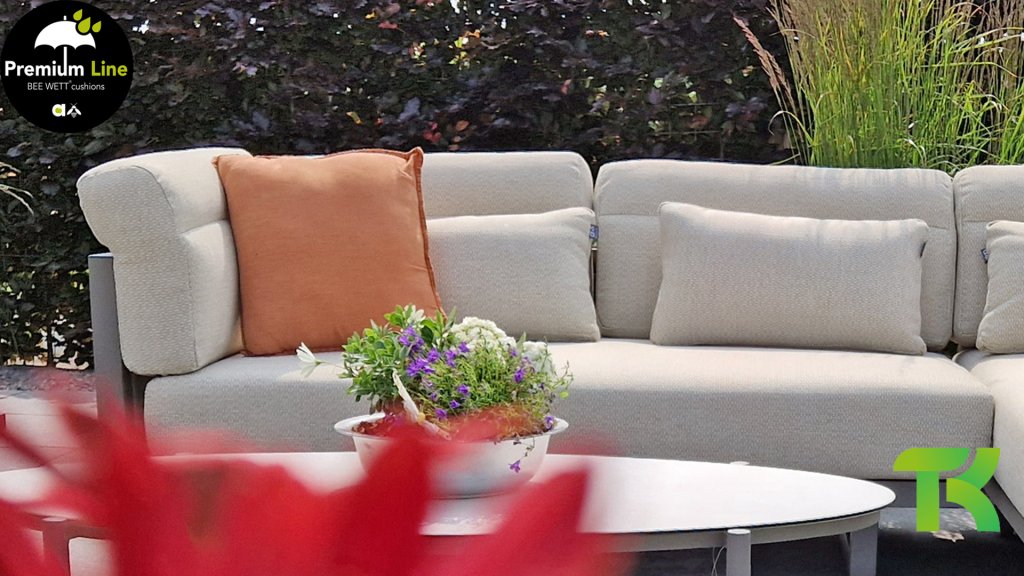 Apple Bee Santorini Lounge: Wenn Sie ein elegantes und kubistisches Lounge-Set mögen, aber keine Kompromisse bei Launen eingehen wollen … schauen Sie hier, das Santorini! Ein schlanker Vierkantrohrrahmen aus Aluminium, pulverbeschichtet in warmem Taupe. Dieses Set ist in zwei Versionen erhältlich. Der Unterschied liegt in den Paneelen in den Armen und im Rücken, die wie ein Gemälde vom Rahmen eingerahmt zu sein scheinen. In der ersten Version ist das Panel mit einem schönen gemischten Seil umwickelt. Dadurch bleibt das Set luftig mit einem zeitgemäßen Look. Die andere Version hat gepolsterte Paneele im gleichen Stoff wie die Kissen. Das verleiht dem Set sofort mehr Klasse und Luxus. Die Arm- und Rückenkissen des Santorini sind etwas Besonderes und biegen sich leicht über die Armlehnen. Sie verleihen den ansonsten klaren Linien einen weichen Touch. Dadurch können Sie sich auch bequem hinlegen. Bequeme Lendenkissen sind im Lieferumfang des Santorini enthalten. So können Sie sich voll und ganz einleben und auch an kühleren Tagen ein gemütliches Plätzchen schaffen.