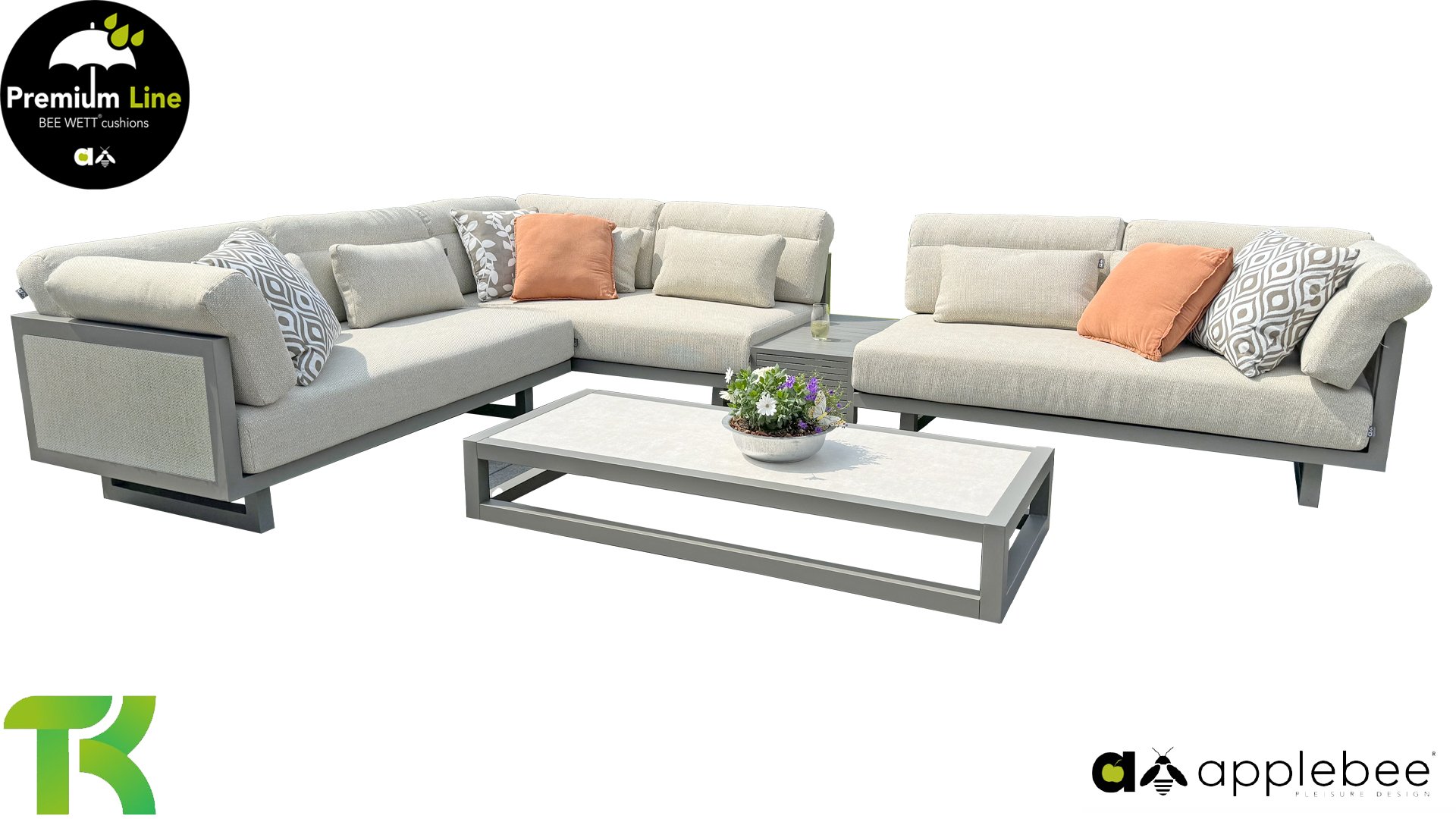 Apple Bee Santorini Lounge: Wenn Sie ein straffes und kubistisches Lounge-Set mögen, aber nicht auf Eigenwilligkeit verzichten möchten... hier ist Santorini! Ein straffes, Aluminium-Vierkantrohrgestell, pulverbeschichtet in warmem Taupe. Dieses Set ist in zwei Ausführungen erhältlich. Der Unterschied liegt in den Paneelen in den Armlehnen und der Rückenlehne, die durch den Rahmen wie ein Gemälde umrahmt wirken. In der ersten Ausführung ist das Paneel mit wunderschön meliertem Seil umwickelt. Dadurch behält das Set Leichtigkeit mit einem zeitgemäßen Look. Die andere Ausführung hat gepolsterte Paneelen im selben Stoff wie die Kissen. Dadurch erhält das Set sofort mehr Klasse und Luxus.