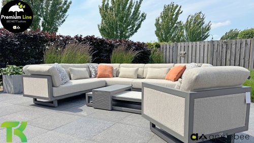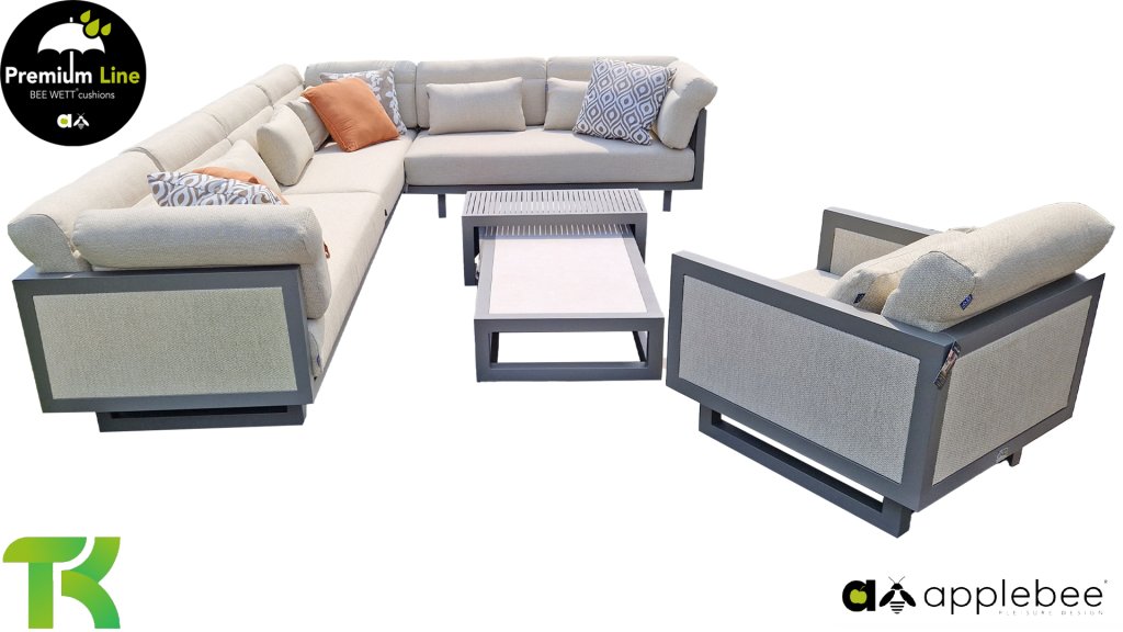 Apple Bee Santorini Lounge: Wenn Sie ein straffes und kubistisches Lounge-Set mögen, aber nicht auf Eigenwilligkeit verzichten möchten... hier ist Santorini! Ein straffes, Aluminium-Vierkantrohrgestell, pulverbeschichtet in warmem Taupe. Dieses Set ist in zwei Ausführungen erhältlich. Der Unterschied liegt in den Paneelen in den Armlehnen und der Rückenlehne, die durch den Rahmen wie ein Gemälde umrahmt wirken. In der ersten Ausführung ist das Paneel mit wunderschön meliertem Seil umwickelt. Dadurch behält das Set Leichtigkeit mit einem zeitgemäßen Look. Die andere Ausführung hat gepolsterte Paneelen im selben Stoff wie die Kissen. Dadurch erhält das Set sofort mehr Klasse und Luxus.