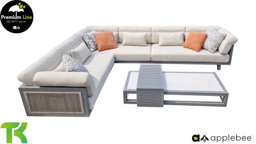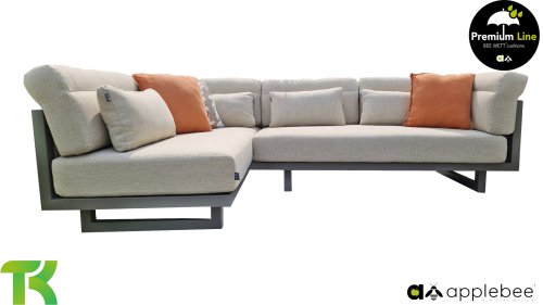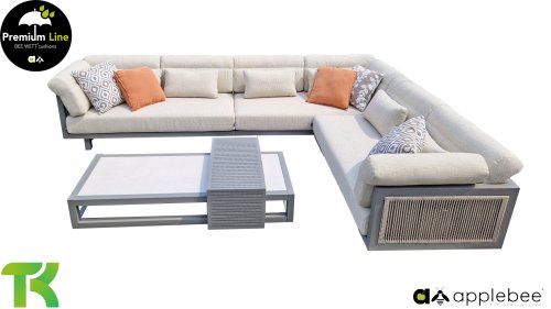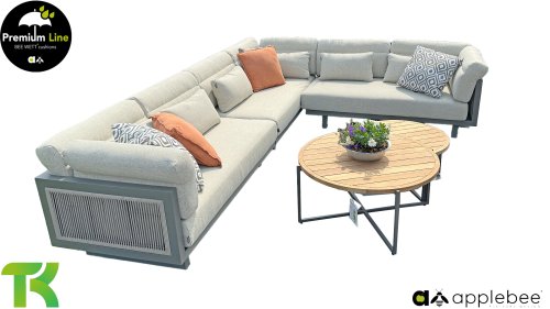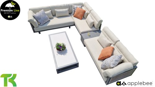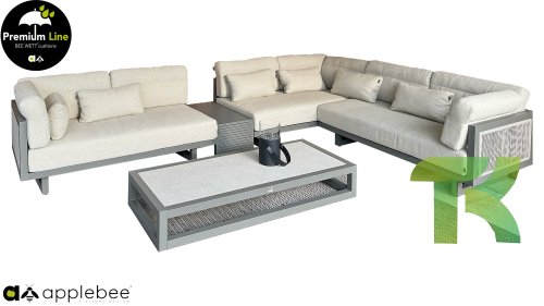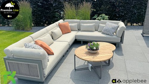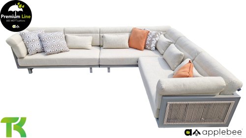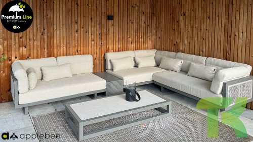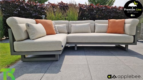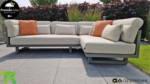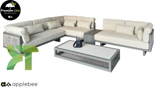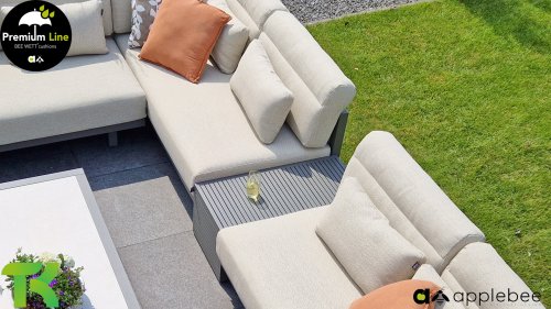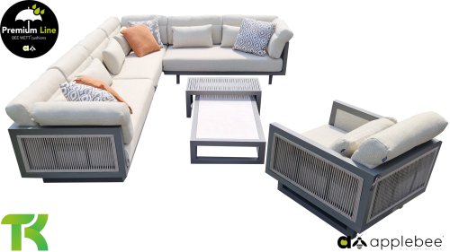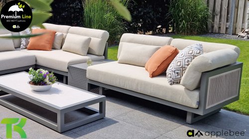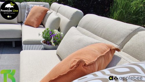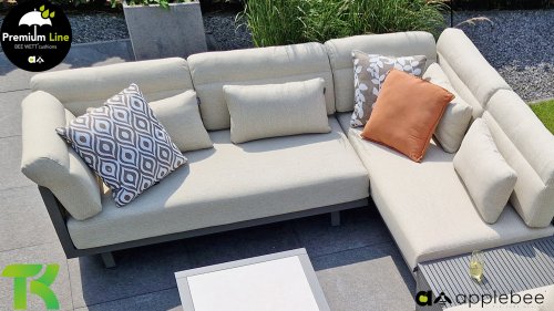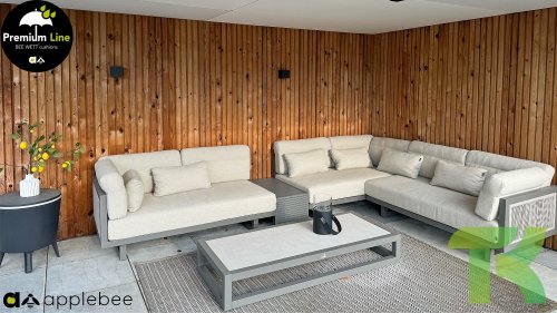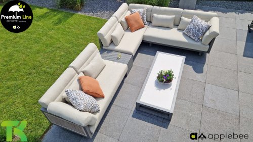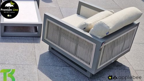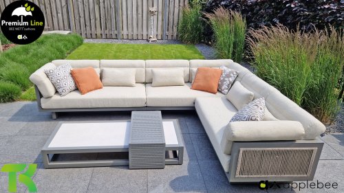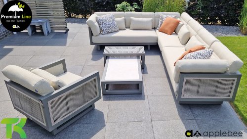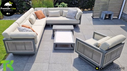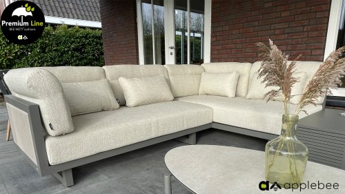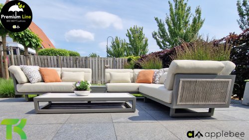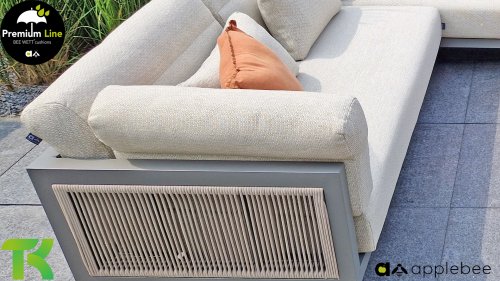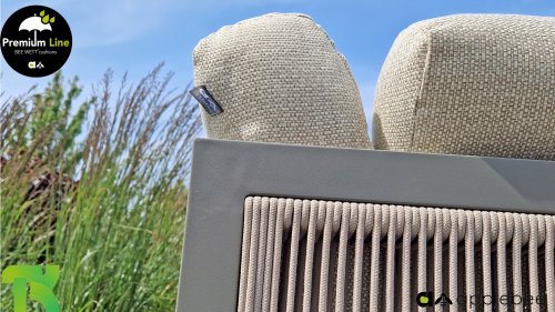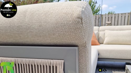 Apple Bee Santorini Lounge Rope: Wenn Sie ein elegantes und kubistisches Lounge-Set mögen, aber keine Kompromisse bei Launen eingehen wollen … schauen Sie hier, das Santorini! Ein schlanker Vierkantrohrrahmen aus Aluminium, pulverbeschichtet in warmem Taupe. Dieses Set ist in zwei Versionen erhältlich. Der Unterschied liegt in den Paneelen in den Armen und im Rücken, die wie ein Gemälde vom Rahmen eingerahmt zu sein scheinen. In der ersten Version ist das Panel mit einem schönen gemischten Seil umwickelt. Dadurch bleibt das Set luftig mit einem zeitgemäßen Look. Die andere Version hat gepolsterte Paneele im gleichen Stoff wie die Kissen. Das verleiht dem Set sofort mehr Klasse und Luxus. Die Arm- und Rückenkissen des Santorini sind etwas Besonderes und biegen sich leicht über die Armlehnen. Sie verleihen den ansonsten klaren Linien einen weichen Touch. Dadurch können Sie sich auch bequem hinlegen. Bequeme Lendenkissen sind im Lieferumfang des Santorini enthalten. So können Sie sich voll und ganz einleben und auch an kühleren Tagen ein gemütliches Plätzchen schaffen.