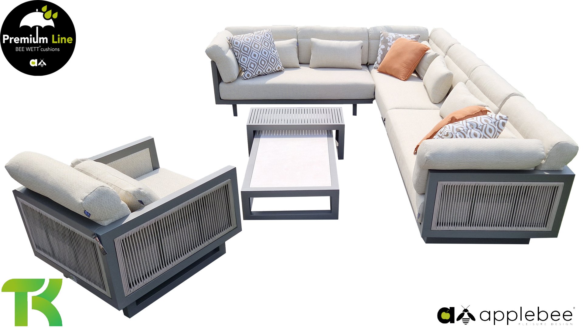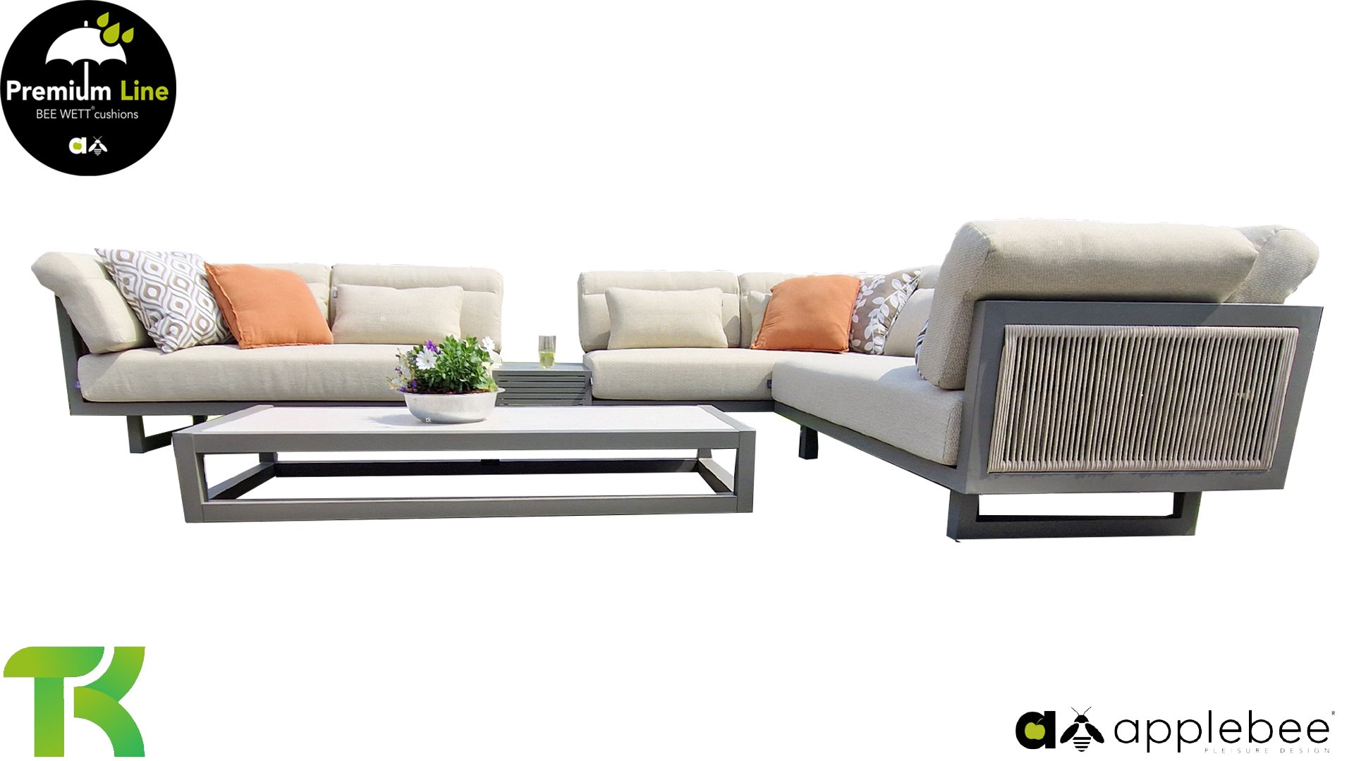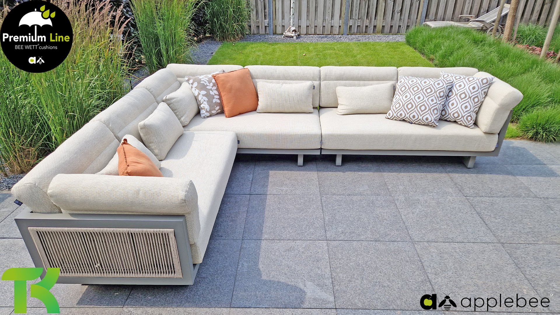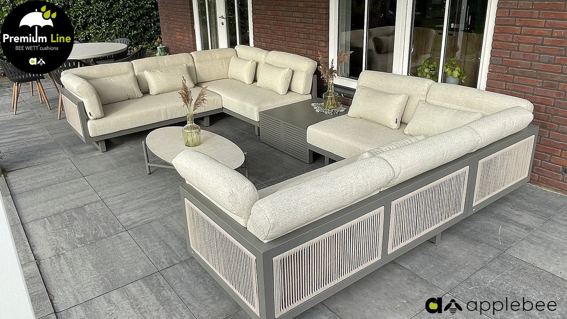 Apple Bee Santorini Lounge Rope: Wenn Sie ein elegantes und kubistisches Lounge-Set mögen, aber keine Kompromisse bei Launen eingehen wollen … schauen Sie hier, das Santorini! Ein schlanker Vierkantrohrrahmen aus Aluminium, pulverbeschichtet in warmem Taupe. Dieses Set ist in zwei Versionen erhältlich. Der Unterschied liegt in den Paneelen in den Armen und im Rücken, die wie ein Gemälde vom Rahmen eingerahmt zu sein scheinen. In der ersten Version ist das Panel mit einem schönen gemischten Seil umwickelt. Dadurch bleibt das Set luftig mit einem zeitgemäßen Look. Die andere Version hat gepolsterte Paneele im gleichen Stoff wie die Kissen. Das verleiht dem Set sofort mehr Klasse und Luxus. Die Arm- und Rückenkissen des Santorini sind etwas Besonderes und biegen sich leicht über die Armlehnen. Sie verleihen den ansonsten klaren Linien einen weichen Touch. Dadurch können Sie sich auch bequem hinlegen. Bequeme Lendenkissen sind im Lieferumfang des Santorini enthalten. So können Sie sich voll und ganz einleben und auch an kühleren Tagen ein gemütliches Plätzchen schaffen.