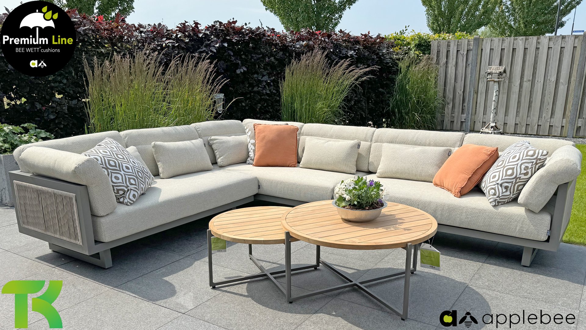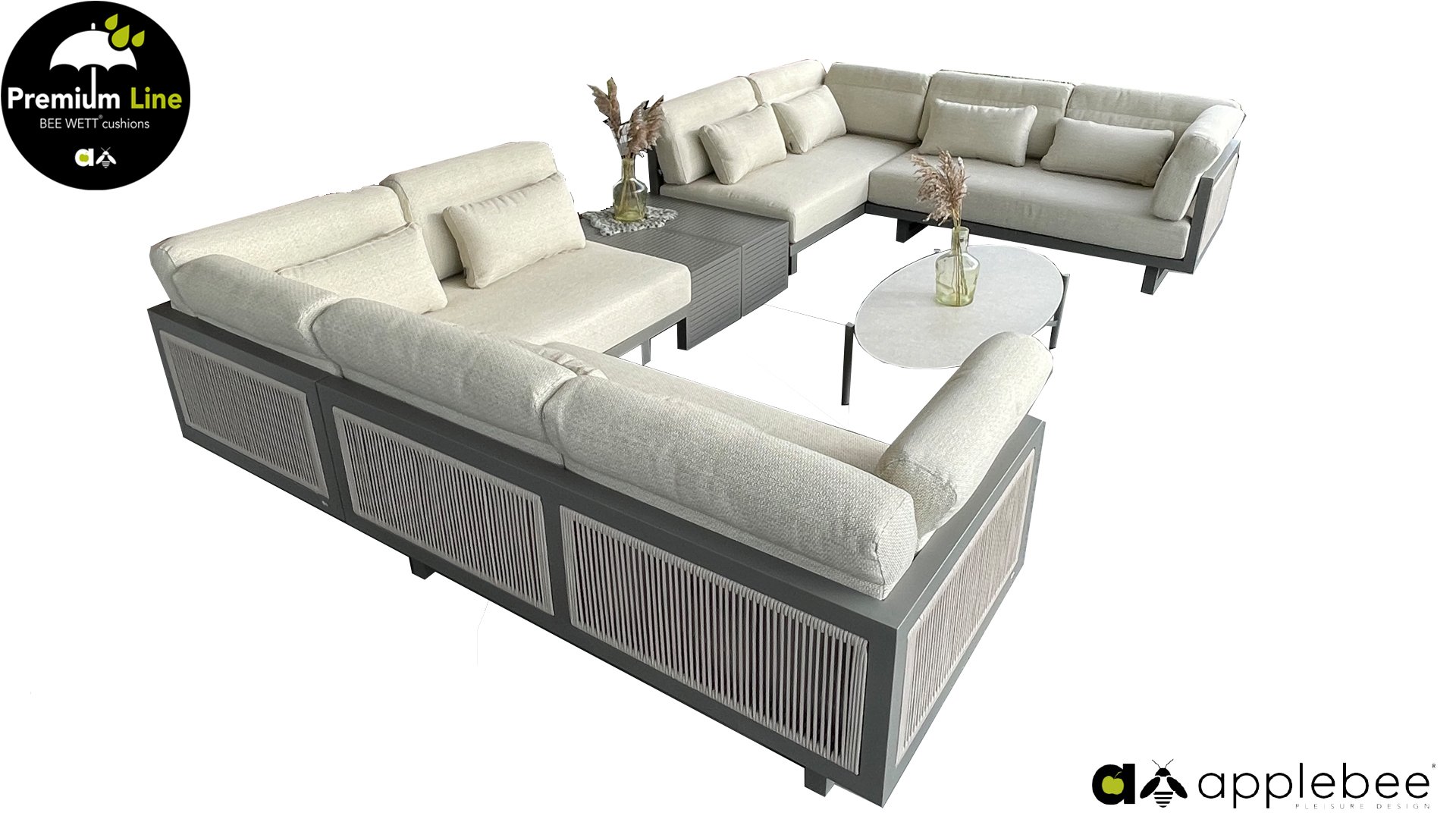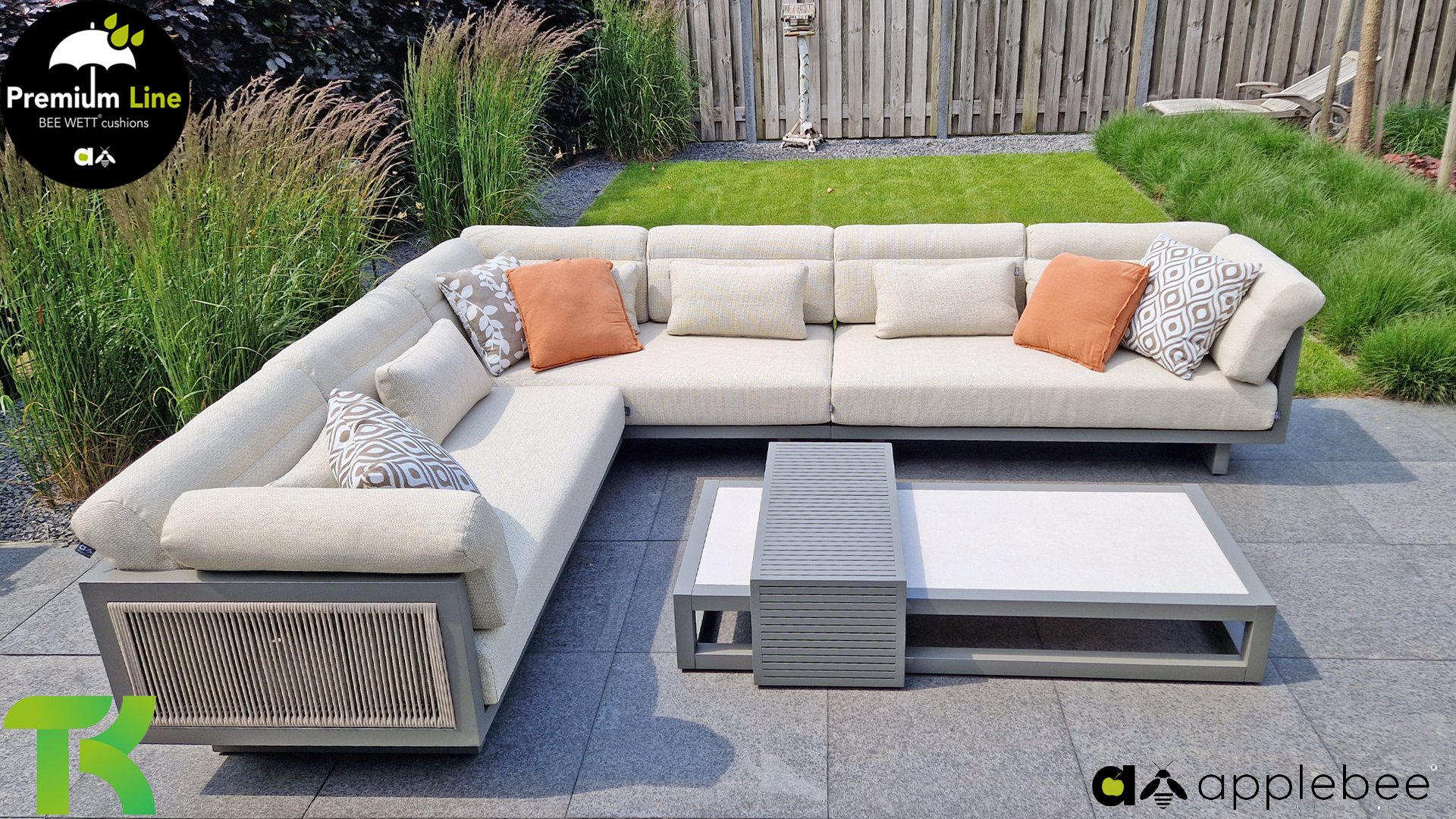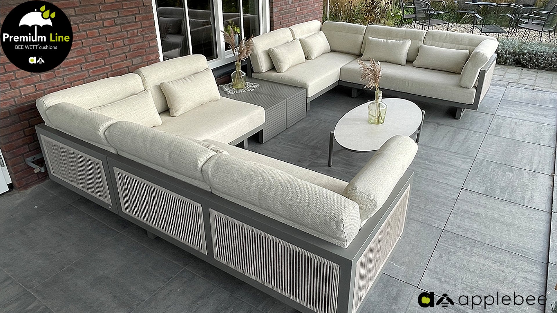 Apple Bee Santorini Lounge Rope: Wenn Sie ein elegantes und kubistisches Lounge-Set mögen, aber keine Kompromisse bei Launen eingehen wollen … schauen Sie hier, das Santorini! Ein schlanker Vierkantrohrrahmen aus Aluminium, pulverbeschichtet in warmem Taupe. Dieses Set ist in zwei Versionen erhältlich. Der Unterschied liegt in den Paneelen in den Armen und im Rücken, die wie ein Gemälde vom Rahmen eingerahmt zu sein scheinen. In der ersten Version ist das Panel mit einem schönen gemischten Seil umwickelt. Dadurch bleibt das Set luftig mit einem zeitgemäßen Look. Die andere Version hat gepolsterte Paneele im gleichen Stoff wie die Kissen. Das verleiht dem Set sofort mehr Klasse und Luxus. Die Arm- und Rückenkissen des Santorini sind etwas Besonderes und biegen sich leicht über die Armlehnen. Sie verleihen den ansonsten klaren Linien einen weichen Touch. Dadurch können Sie sich auch bequem hinlegen. Bequeme Lendenkissen sind im Lieferumfang des Santorini enthalten. So können Sie sich voll und ganz einleben und auch an kühleren Tagen ein gemütliches Plätzchen schaffen.