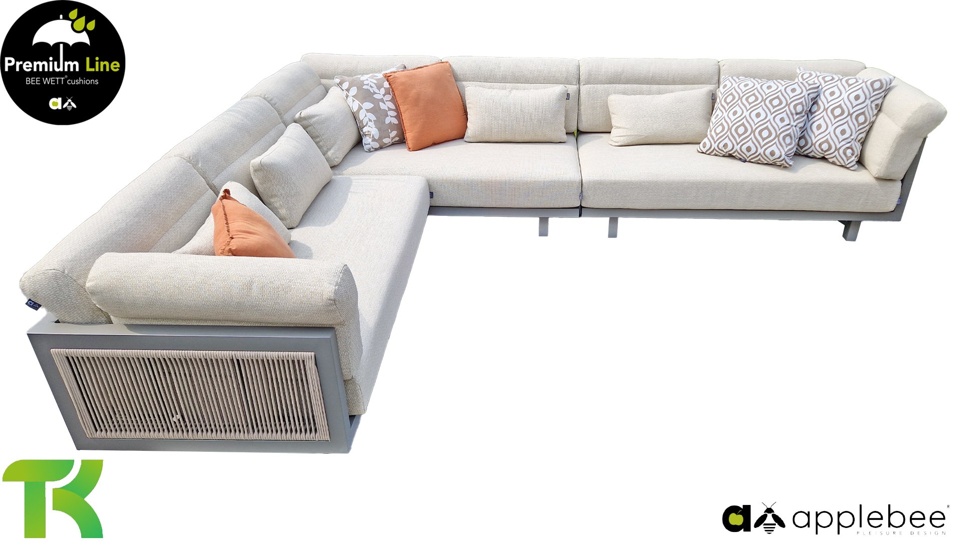 Apple Bee Santorini Lounge Rope: Wenn Sie eine elegante, kubistische Lounge-Garnitur lieben, aber dennoch Wert auf Individualität legen, dann ist die Santorini genau das Richtige für Sie! Ein schlankes, quadratisches Aluminiumrohrgestell, pulverbeschichtet in warmem Taupe. Diese Garnitur ist in zwei Ausführungen erhältlich. Der Unterschied liegt in den Paneelen an Armlehnen und Rückenlehne, die wie ein Gemälde vom Gestell eingerahmt werden. Bei der ersten Ausführung sind die Paneele mit einem wunderschönen, melierten Seil umwickelt. Dies verleiht der Garnitur eine luftige und zugleich moderne Optik. Die zweite Ausführung besticht durch gepolsterte Paneele im gleichen Stoff wie die Kissen und verleiht ihr so einen Hauch von Klasse und Luxus.
