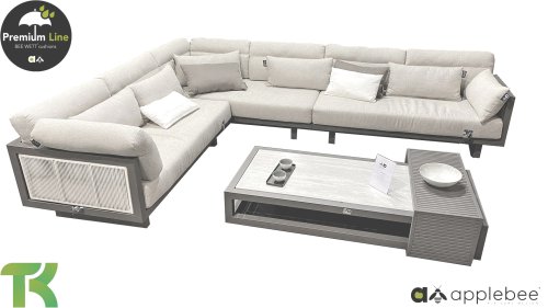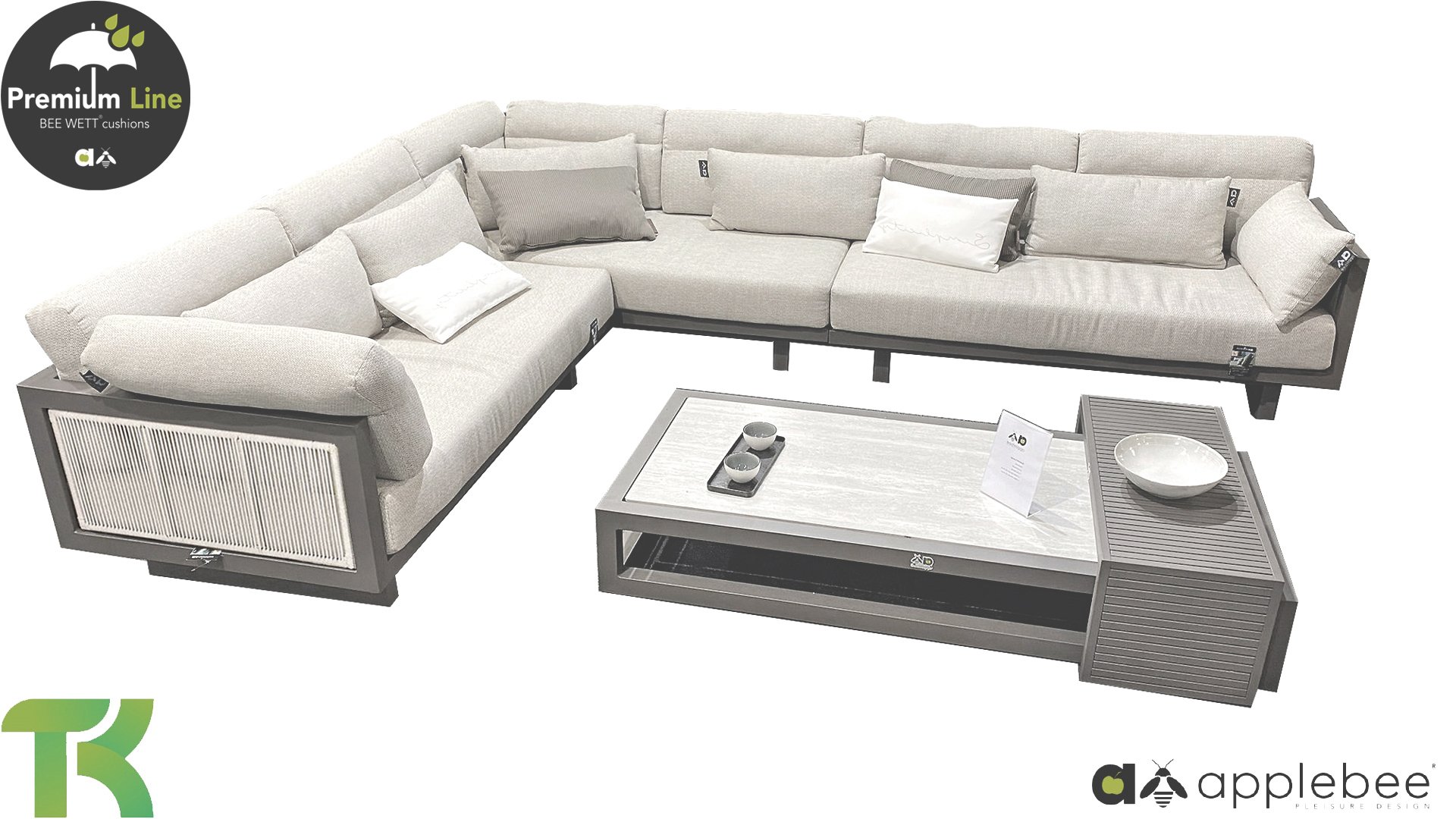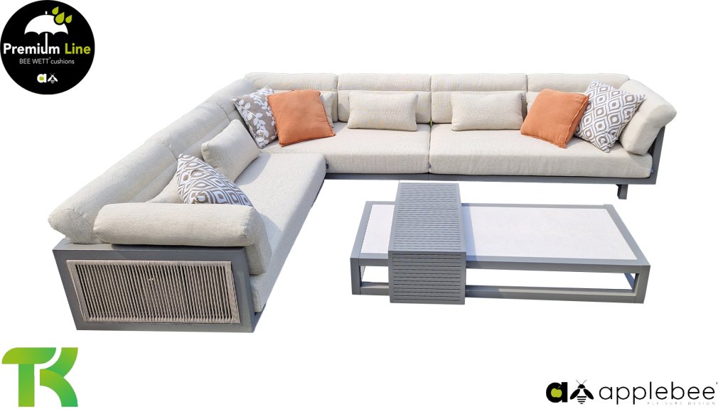 Apple Bee Santorini Lounge Rope: Wenn Sie eine elegante, kubistische Lounge-Garnitur lieben, aber dennoch Wert auf Individualität legen, dann ist die Santorini genau das Richtige für Sie! Ein schlankes, quadratisches Aluminiumrohrgestell, pulverbeschichtet in warmem Taupe. Diese Garnitur ist in zwei Ausführungen erhältlich. Der Unterschied liegt in den Paneelen an Armlehnen und Rückenlehne, die wie ein Gemälde vom Gestell eingerahmt werden. Bei der ersten Ausführung sind die Paneele mit einem wunderschönen, melierten Seil umwickelt. Dies verleiht der Garnitur eine luftige und zugleich moderne Optik. Die zweite Ausführung besticht durch gepolsterte Paneele im gleichen Stoff wie die Kissen und verleiht ihr so ​​einen Hauch von Klasse und Luxus.