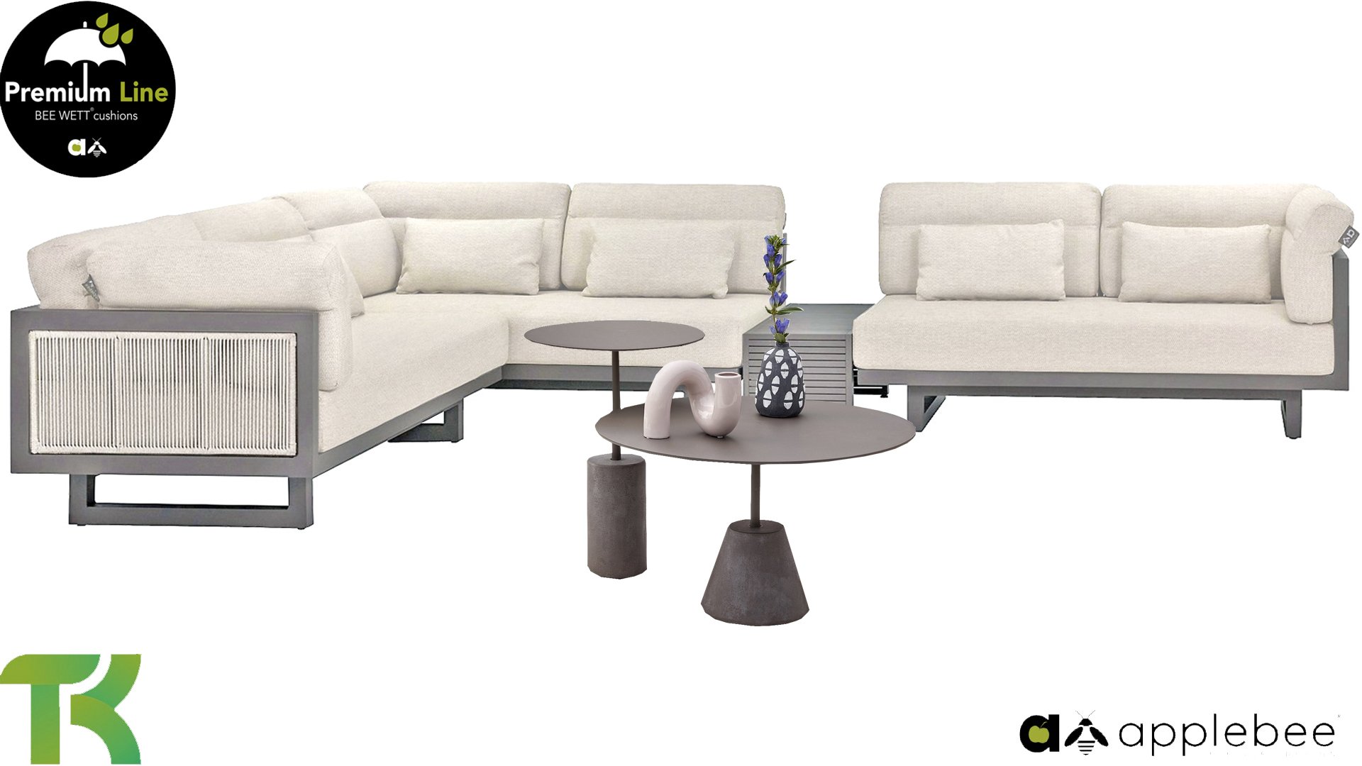 Apple Bee Santorini Lounge Rope: Wenn Sie eine elegante, kubistische Lounge-Garnitur lieben, aber dennoch Wert auf Individualität legen, dann ist die Santorini genau das Richtige für Sie! Ein schlankes, quadratisches Aluminiumrohrgestell, pulverbeschichtet in warmem Taupe. Diese Garnitur ist in zwei Ausführungen erhältlich. Der Unterschied liegt in den Paneelen an Armlehnen und Rückenlehne, die wie ein Gemälde vom Gestell eingerahmt werden. Bei der ersten Ausführung sind die Paneele mit einem wunderschönen, melierten Seil umwickelt. Dies verleiht der Garnitur eine luftige und zugleich moderne Optik. Die zweite Ausführung besticht durch gepolsterte Paneele im gleichen Stoff wie die Kissen und verleiht ihr so ​​einen Hauch von Klasse und Luxus.