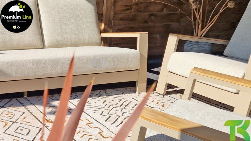Ein strenges diagonales Linienmuster, sorgfältig verarbeitetes Aluminium, pulverbeschichtet in einer schönen Latte Farbe und weiche, komfortable Kissen in sandfarbenem Stoff. Ein Hauch von Teak auf der Lehne rundet das Set ab und verleiht ihm das gewisse Extra-Detail. Mit einer Dekoration in Ihrem eigenen Stil können Sie im Handumdrehen Ihren eigenen Dreh an diesem 'Sonnennest' geben.