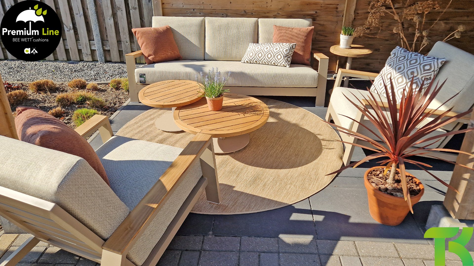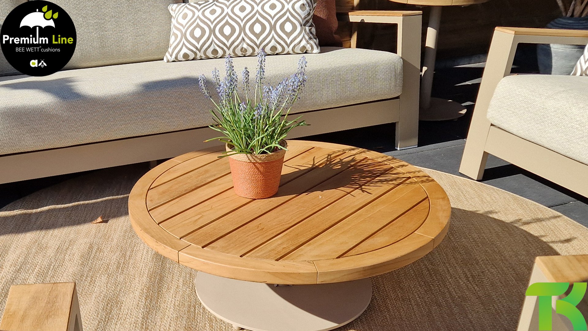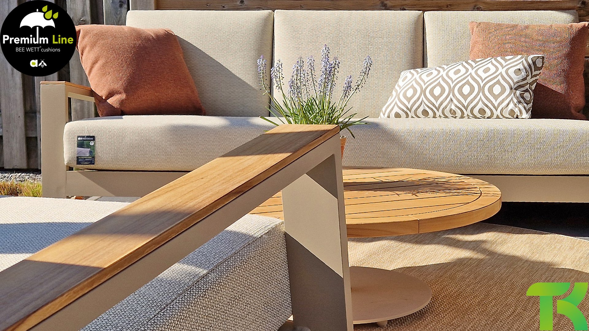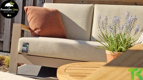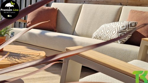 Ein strenges diagonales Linienmuster, sorgfältig verarbeitetes Aluminium, pulverbeschichtet in einer schönen Latte Farbe und weiche, komfortable Kissen in sandfarbenem Stoff. Ein Hauch von Teak auf der Lehne rundet das Set ab und verleiht ihm das gewisse Extra-Detail. Mit einer Dekoration in Ihrem eigenen Stil können Sie im Handumdrehen Ihren eigenen Dreh an diesem 'Sonnennest' geben.