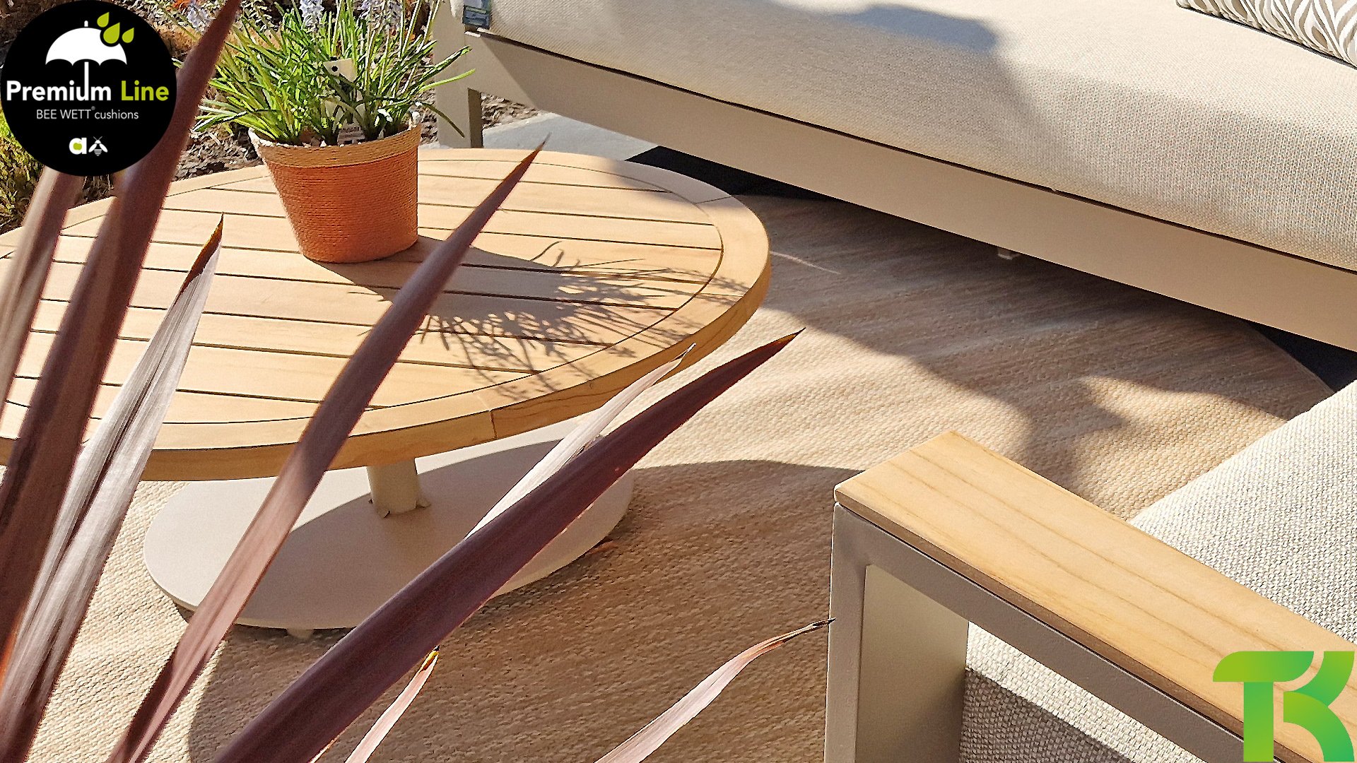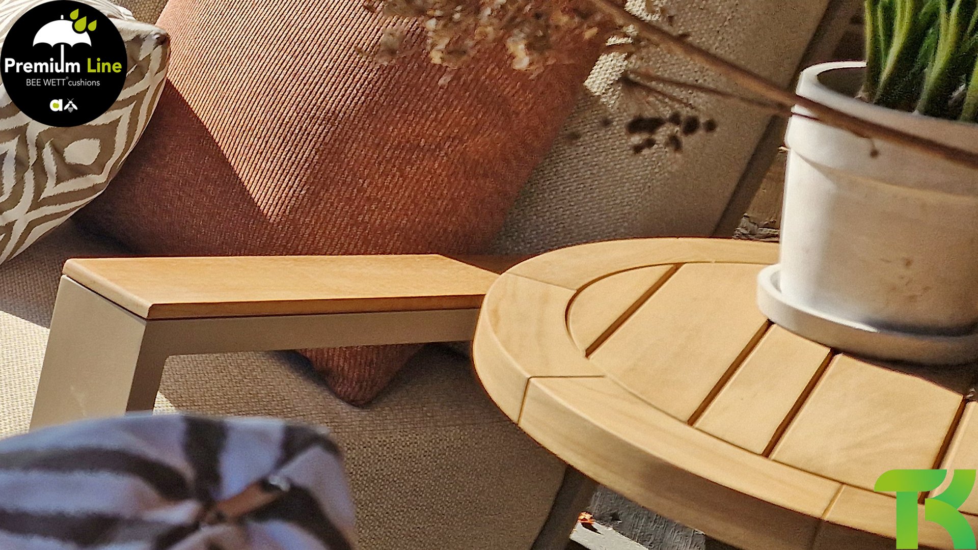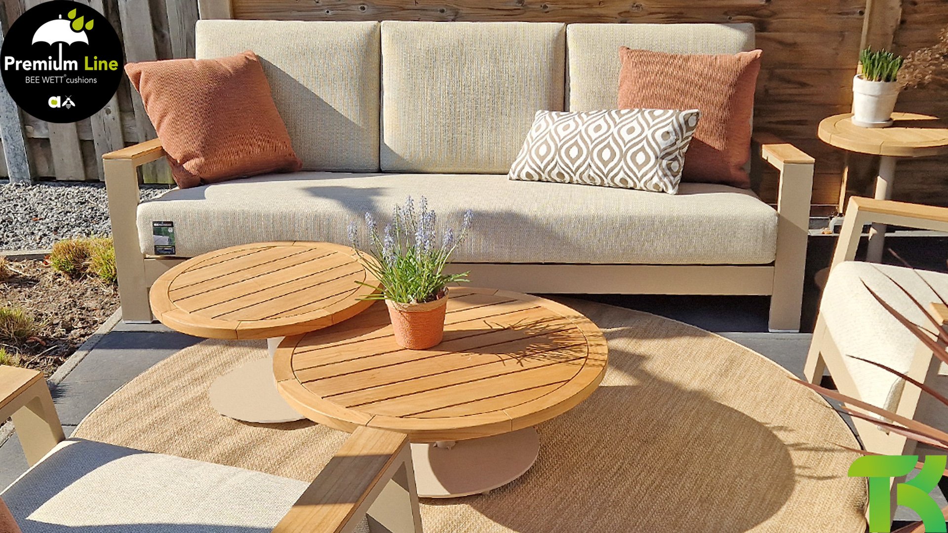 Ein strenges diagonales Linienmuster, sorgfältig verarbeitetes Aluminium, pulverbeschichtet in einer schönen Latte Farbe und weiche, komfortable Kissen in sandfarbenem Stoff. Ein Hauch von Teak auf der Lehne rundet das Set ab und verleiht ihm das gewisse Extra-Detail. Mit einer Dekoration in Ihrem eigenen Stil können Sie im Handumdrehen Ihren eigenen Dreh an diesem 'Sonnennest' geben.