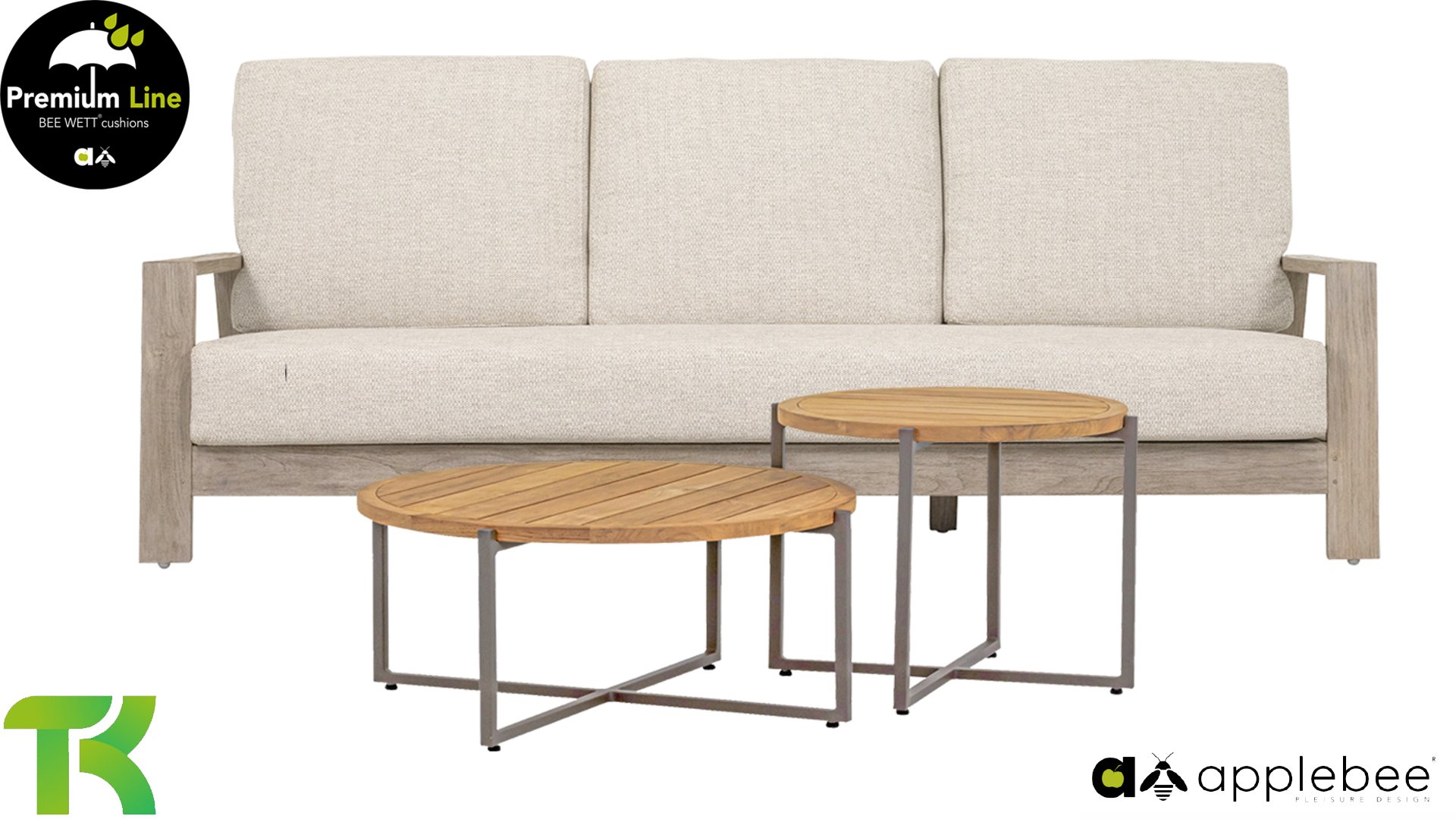 Die Apple Bee Spring Teak-Kollektion besticht durch ihr minimalistisches und klares Design, das dank seiner einzigartigen Formgebung dennoch beeindruckt. Elegante diagonale Linien, handgefertigtes Teakholz in Küstenoptik und weiche, bequeme Kissen mit sandfarbenem Bezug zeichnen dieses Set aus. Gefertigt aus hochwertigem Teakholz, ist es auch ohne Kissen ein wahrer Augenschmaus in Ihrem Garten. Ein harmonisches Gesamtbild! Mit ein paar schönen Dekokissen nach Ihrem Geschmack schaffen Sie im Handumdrehen Ihre ganz persönliche Wohlfühloase in der Sonne.