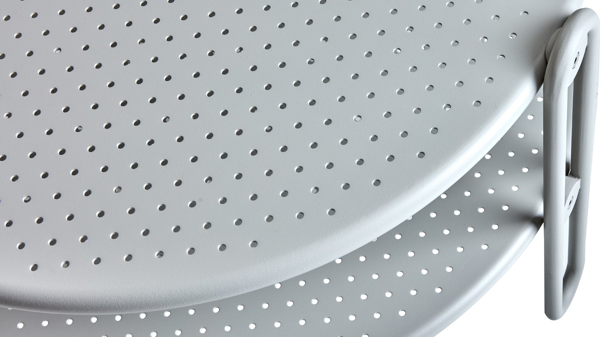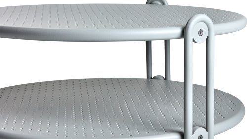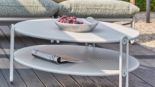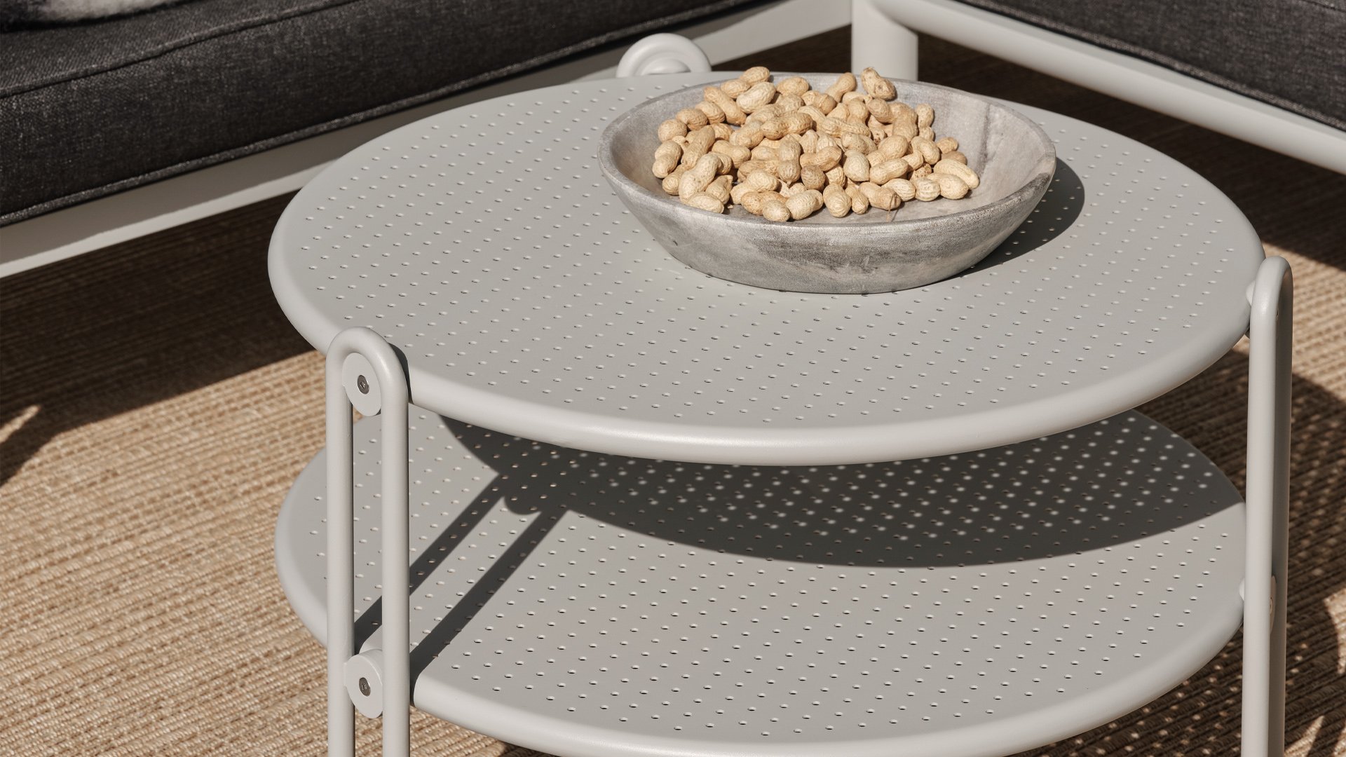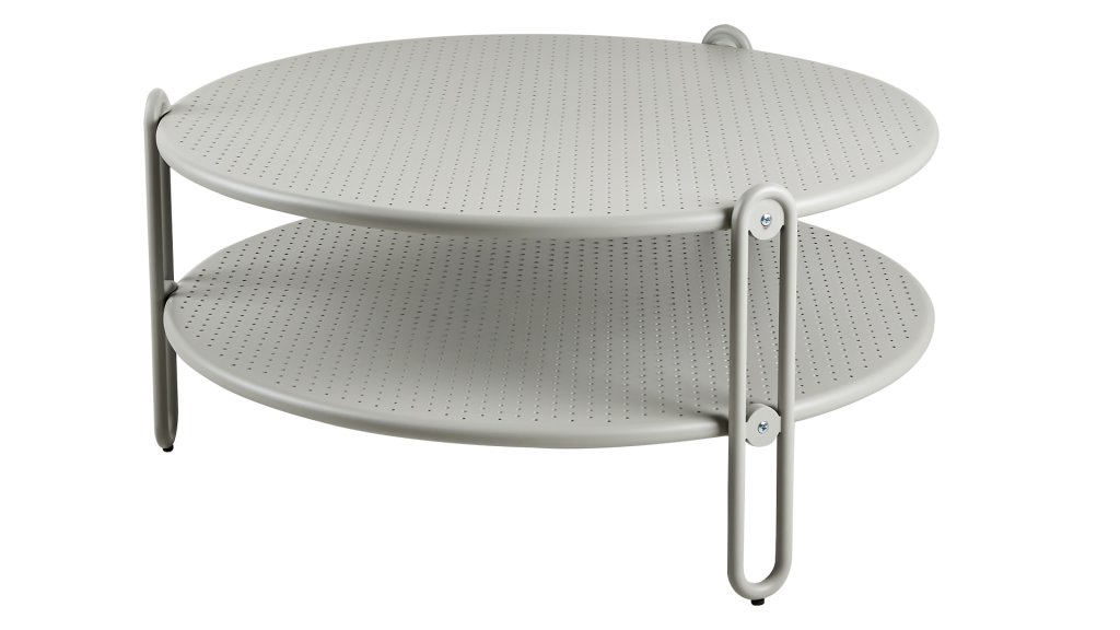 De ronde Blixt salontafel is verkrijgbaar in twee hoogtes en formaten: een hogere (42 cm) met een diameter van 65 cm en een lagere (39 cm) met een diameter van 85 cm. De twee ronde metalen bladen op verschillende niveaus zijn geperforeerd – een mooi en ook praktisch detail. Verkrijgbaar in matzwart en wit. Plaats ze alleen of met twee - ze kunnen elkaar deels overlappen dankzij het kleine hoogteverschil.