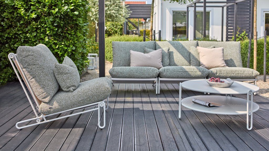Ein bequemer Sessel, der ein Statement setzt. Die schräge Sitzfläche und der offene Aluminiumrahmen schaffen einen wunderbaren Ort zum Entspannen. Die Kissen sind in Rosa, Grau und Beige erhältlich. Als Teil der BRAFAB-Reihe von Outdoor-Möbeln ist das BRAFAB BLIXT Outdoor-Sofa ein modernes Sofa zum Zusammenbauen mit einem Aluminiumrahmen und einer Sitzfläche aus Textilene. Die bequemen Kissen bestehen aus wasserabweisendem Olefin-Gewebe. Jeder Sessel kann als freistehender Sessel verwendet oder zu einem Outdoor-Sofa verbunden werden, so lange Sie möchten!
