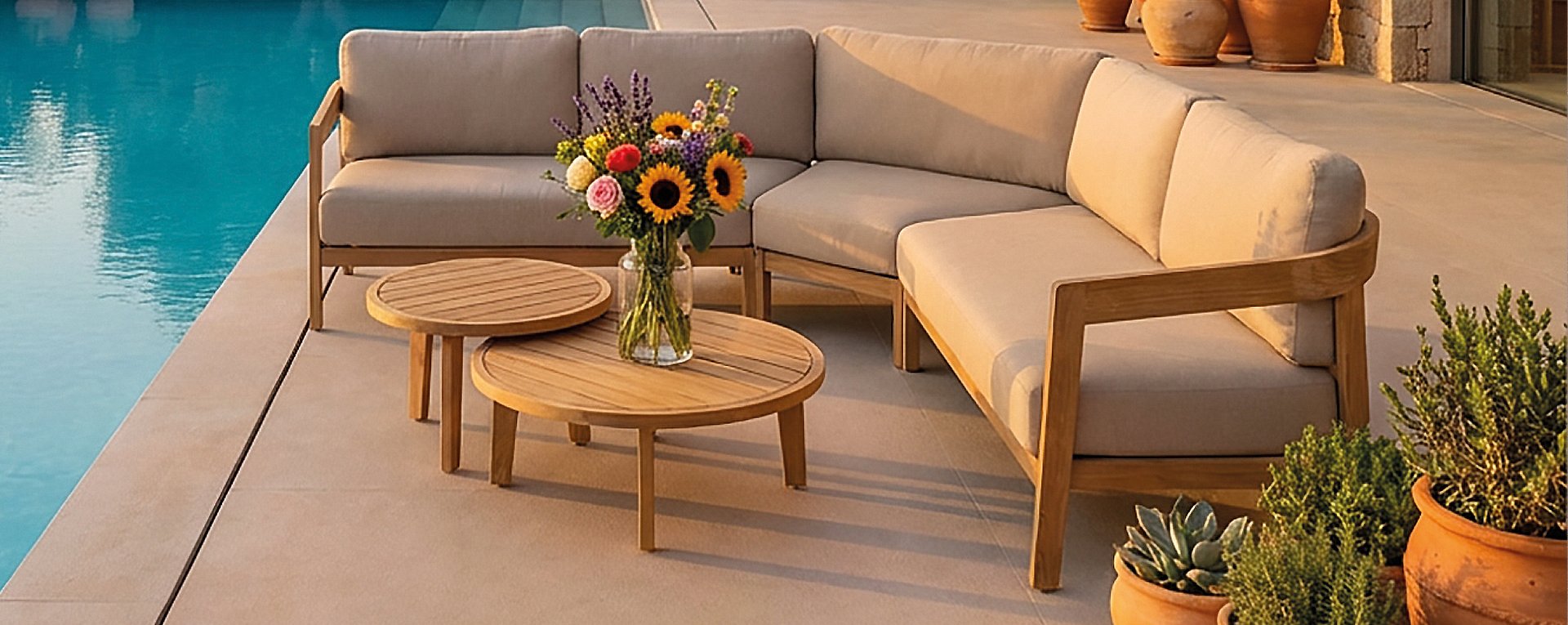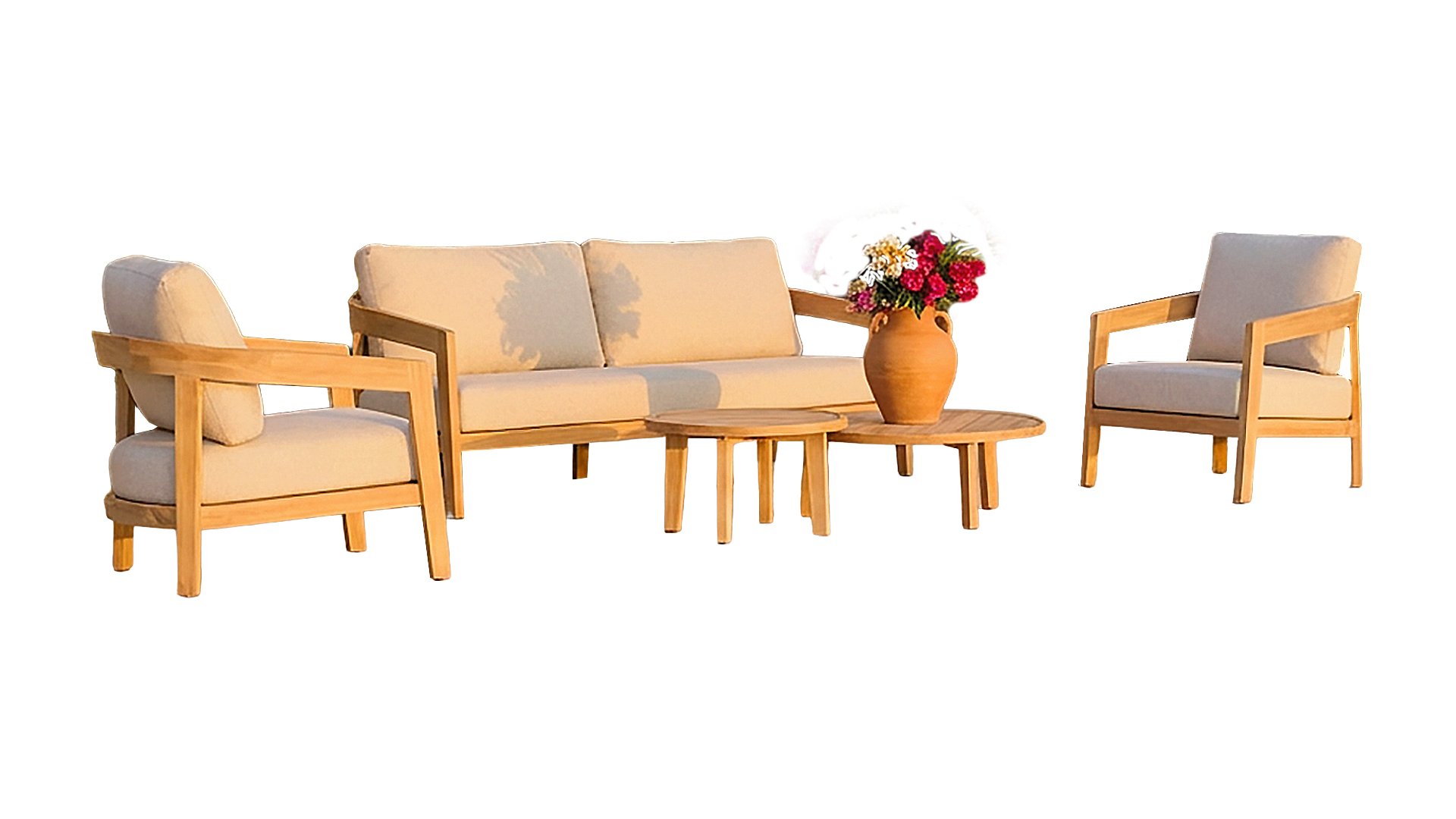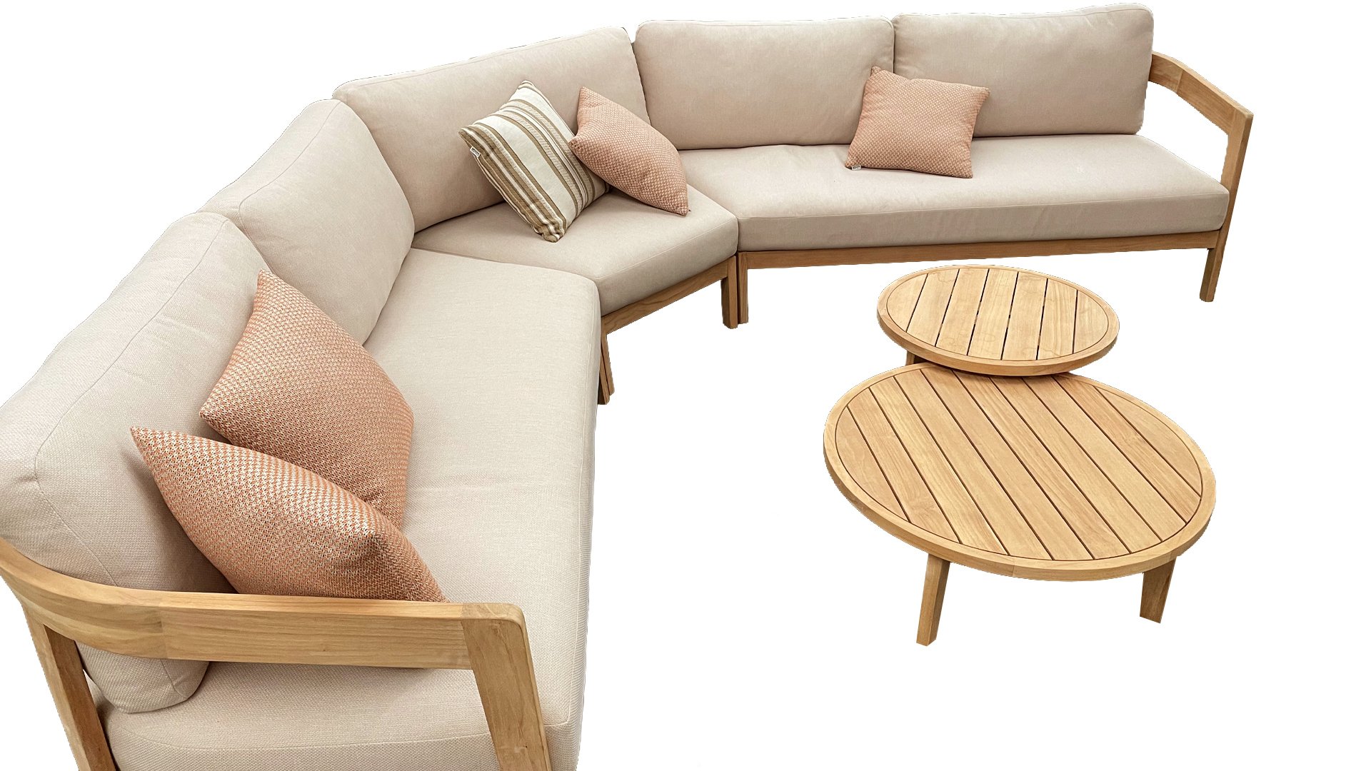 Entdecken Sie das Lecce Lounge-Set von Gescova. ✓ Warmes Teakholzgestell ✓ Dicke, wetterfeste Kissen ✓ Elegantes, rundes Design ✓ Modulare Konfiguration ✓ Besuchen Sie unseren Showroom ✓ Die gesamte Gescova Gartenmöbelkollektion verfügbar ✓ Fordern Sie ein unverbindliches Angebot an und erhalten Sie einen persönlichen Rabatt.