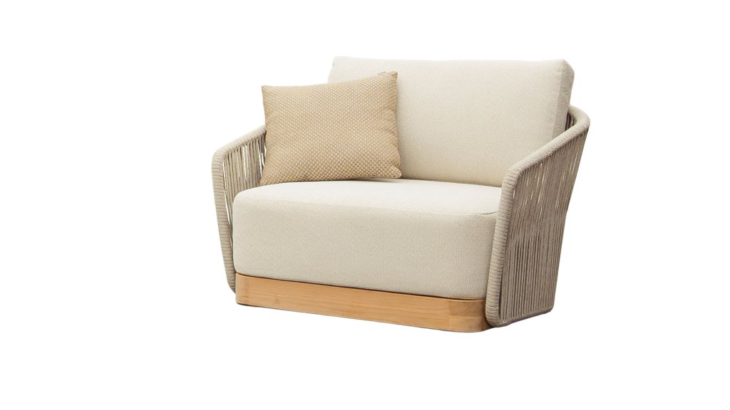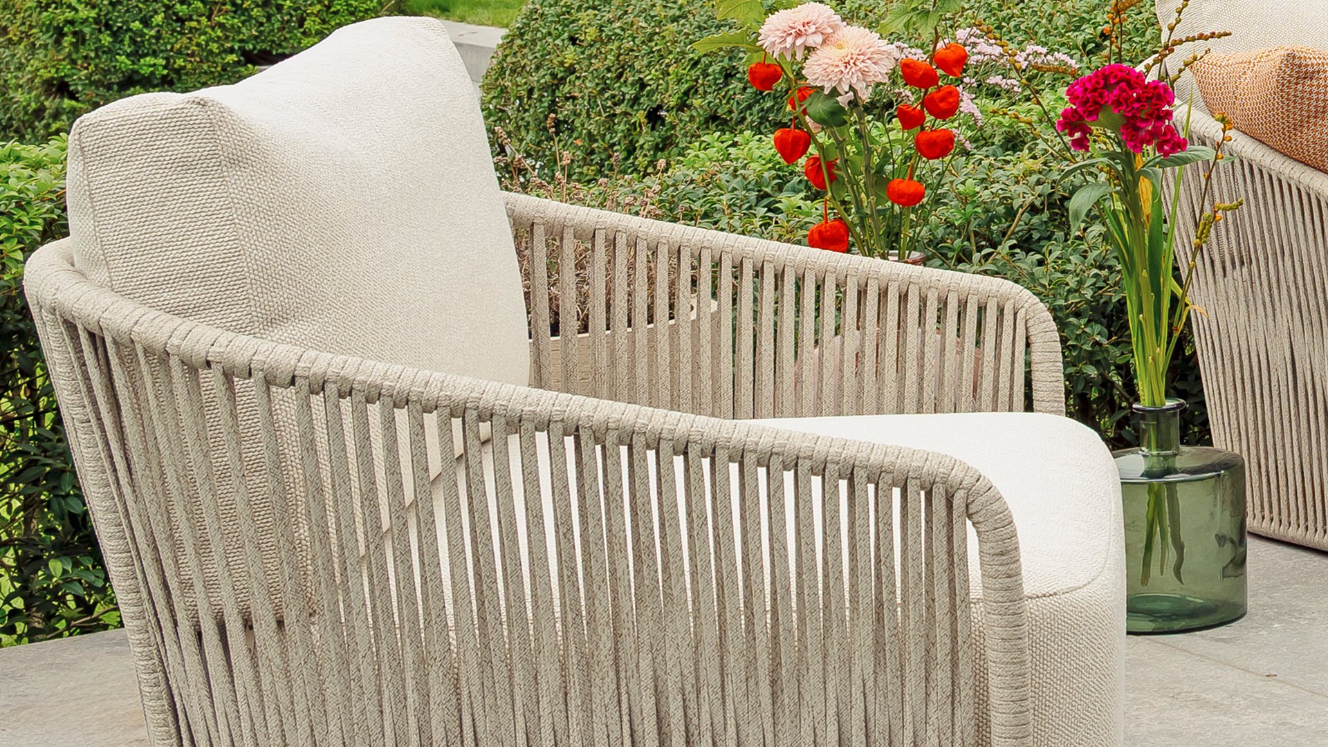 Langlebige Materialien wie Rope, Teak, Edelstahl (RVS), Aluminium und Olefin-Kissen.