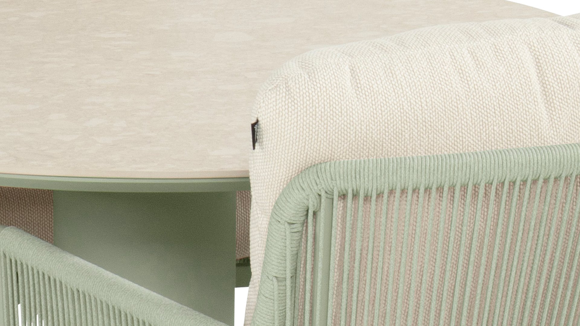 Das Zaragoza Lounge- Diningset in den Farben Sand, Cappuccino oder Soft Green lädt zum ultimativen Entspannen ein. Der Aluminiumrahmen und die beigen Kissen sowie die Keramikplatte sind pflegeleicht und wetterbeständig. Dieses Set ist perfekt für lange Sommerabende mit Freunden oder Familie.