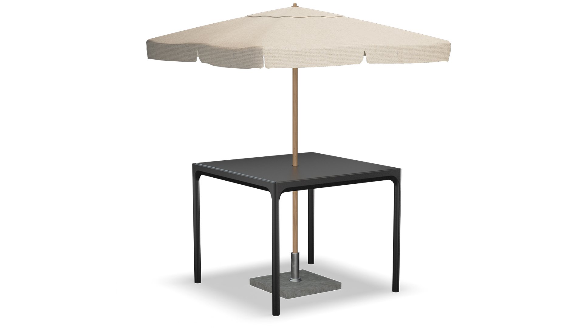 Der Houe Four Tisch ist ein robustes Modell, das sich ideal für industrielle oder rustikale Interieurs eignet. Er ist wetterfest und verfügt über ein stabiles Aluminiumgestell, das in den pulverbeschichteten Farben Black, Olive Green oder Muted White erhältlich ist. Der 90 x 90 cm große Tisch ist mit einer Öffnung für einen Sonnenschirm ausgestattet.