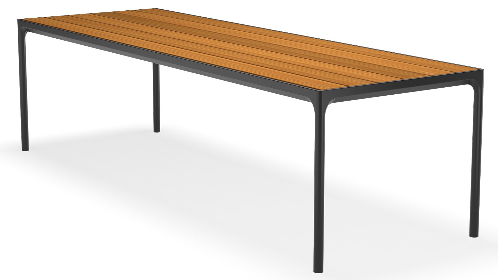 Der Four Tisch von Houe ist ein robustes Modell, das gut in ein industrielles oder robustes Interieur passt. Der Tisch wurde entworfen, um Wind und Wetter standzuhalten. Der Four Tisch hat einen starken Aluminiumrahmen, der in pulverbeschichtetem Grau oder Schwarz erhältlich ist. Die Bambusplatte hat eine Struktur, die sehr gut für den Außenbereich geeignet ist. Der Tisch ist in den Maßen mit einer Länge von 90 , 160 , 210 und 270 cm erhältlich und haben alle eine Breite von 90 cm und eine Höhe von 74 cm (Bartisch 90 cm und 160 cm).  Bambus ist eine nachhaltigere Alternative zu Teakholz. Wir empfehlen jedoch, den Bambus 2-3 Mal im Jahr mit Öl einzureiben, damit der Tisch seine warmen Farben länger behält.