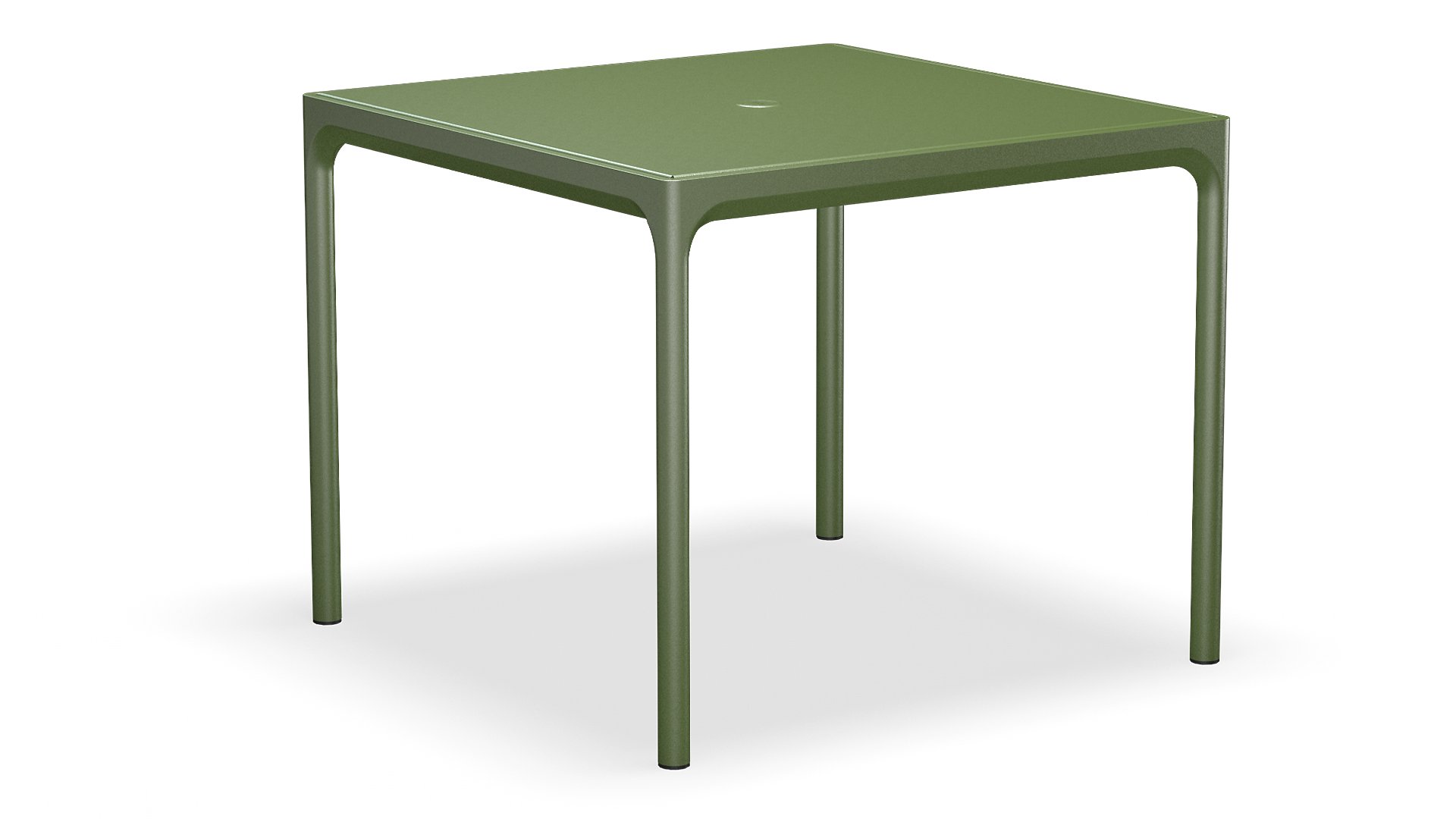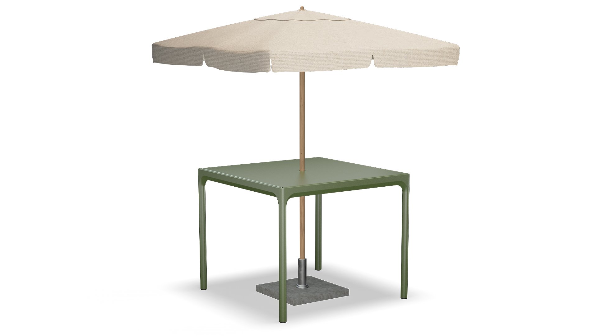 Der Houe Four Tisch ist ein robustes Modell, das sich ideal für industrielle oder rustikale Interieurs eignet. Er ist wetterfest und verfügt über ein stabiles Aluminiumgestell, das in den pulverbeschichteten Farben Black, Olive Green oder Muted White erhältlich ist. Der 90 x 90 cm große Tisch ist mit einer Öffnung für einen Sonnenschirm ausgestattet.