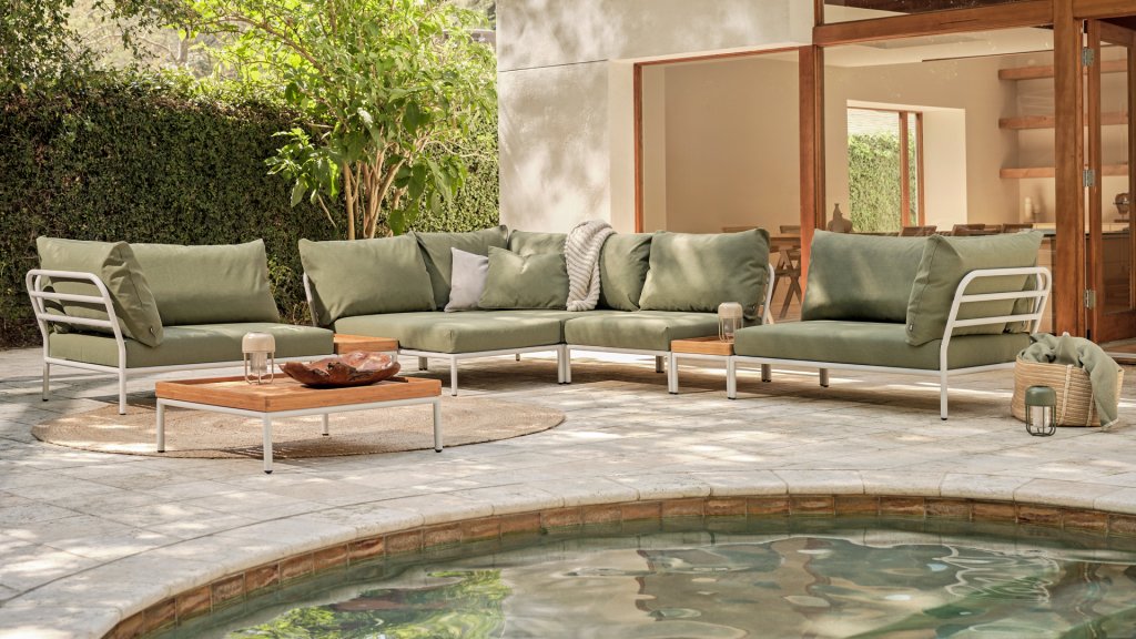 Wasser fließt direkt durch den speziellen Schaum hindurch, während ein weiteres Material, Dacron, dafür sorgt, dass die Kissen ihre originale Form behalten. Die Polster sind ausziehbar und waschbar. Die Kissen in der Lounge sind mit einem speziellen Outdoor-Stoff mit einer Basis aus Quickdry-Schaum versehen. Dadurch sind die Kissen in kürzester Zeit wieder trocken und es bildet sich kein Schimmel. Die Stoffe sind leicht mit einem milden Reinigungsmittel zu reinigen. Die Kissen sind abnehmbar und bei 30 Grad waschbar.Die Kissen in Alpengrün und Esche in Hellgrau / Ecru-Farbe die Char Farbe bestehen aus Sunbrella Heritage-Material, das zu 50% aus recyceltem Acryl besteht. Bunte Faserenden aus dem Recycling des Primärmaterials können im Stoff auftreten und die Stofffarbe von Charge zu Charge variieren. Dadurch entsteht ein einzigartiger Stoff mit natürlichem Aussehen und Vintage-Charme. Der Stoff ist Oeko-tex-zertifiziert, wasserabweisend, schmutzabweisend und wartungsfreundlich.