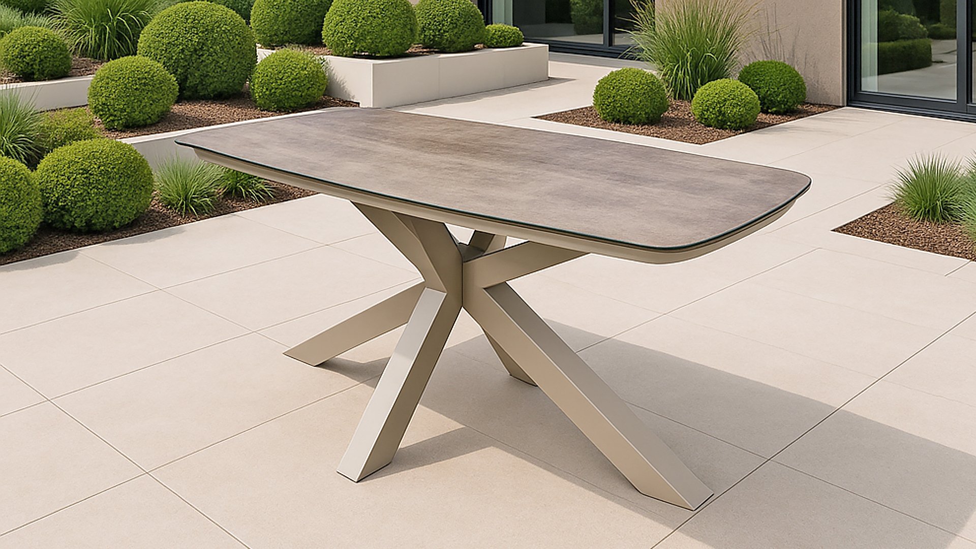 Der Tisch Valerie 220cm ist aus pulverbeschichtetem Aluminium in Taupe gefertigt und verfügt über eine 8 mm starke Keramik-auf-Glas-Tischplatte. Er ist nahezu wartungsfrei. Dieser formschöne Tisch vereint Funktionalität mit stilvollem Design und ist somit die ideale Wahl für alle, die gerne Zeit im Freien verbringen.