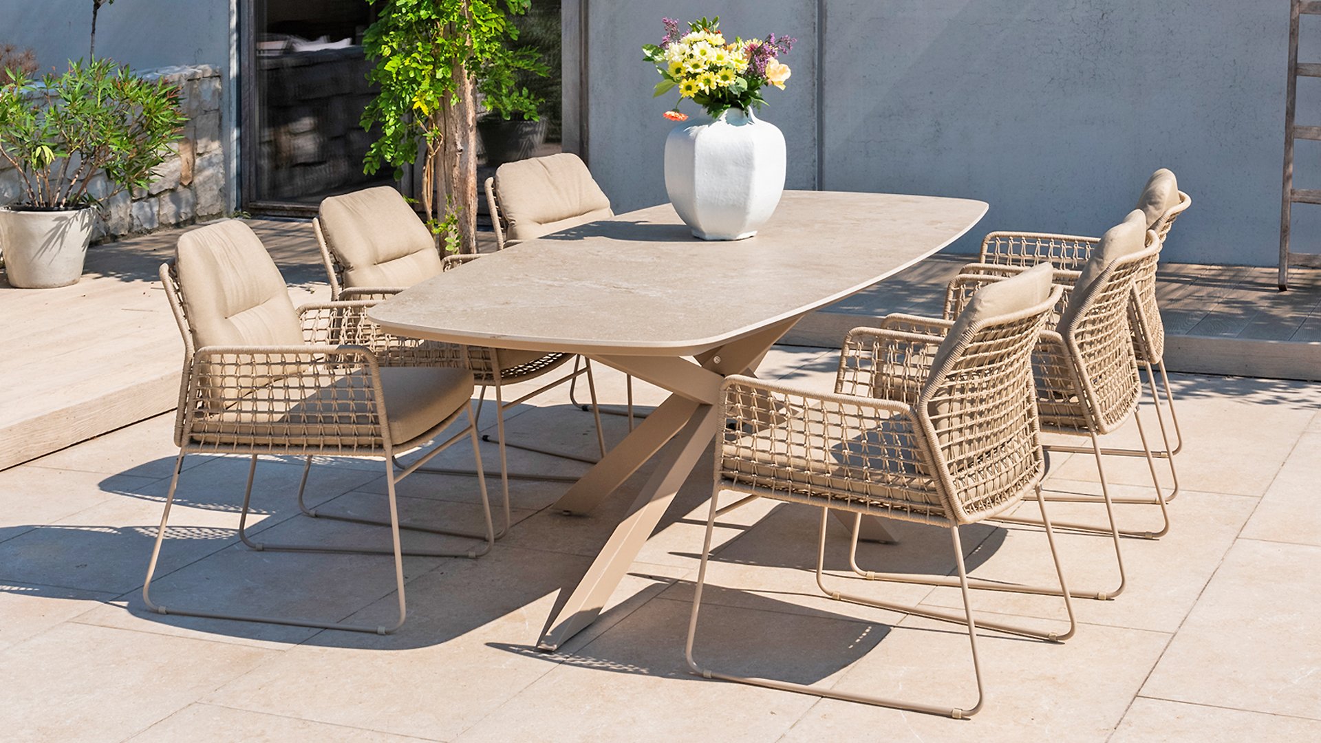 ⭐ Besuchen Sie unseren Showroom – Herzlich willkommen! Möchten Sie selbst sehen und ihren Komfort erleben? Dann besuchen Sie unseren Ausstellungsraum! Entdecken Sie das einzigartige Seilmuster, fühlen Sie die luxuriösen Kissen und lassen Sie sich von unseren Gartenmöbelexperten beraten.