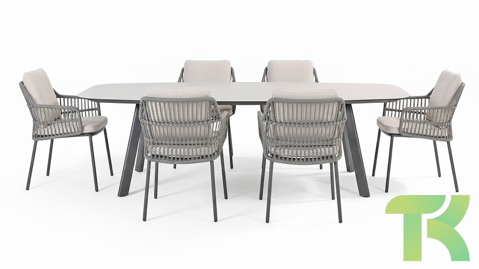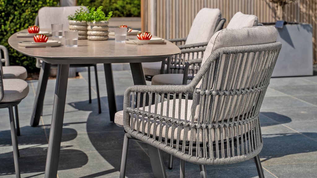 Die formschönen Kurven, das robuste, anthrazitfarben pulverbeschichtete Aluminiumgestell und das stilvolle graue Seilgeflecht machen den Alicante Stuhl zu einer eleganten und zeitlosen Wahl für jeden Außenbereich. Die mitgelieferten hellgrauen Kissen bieten luxuriösen Sitzkomfort, egal ob Sie speisen oder einfach nur entspannen.