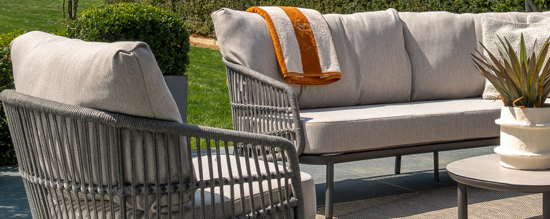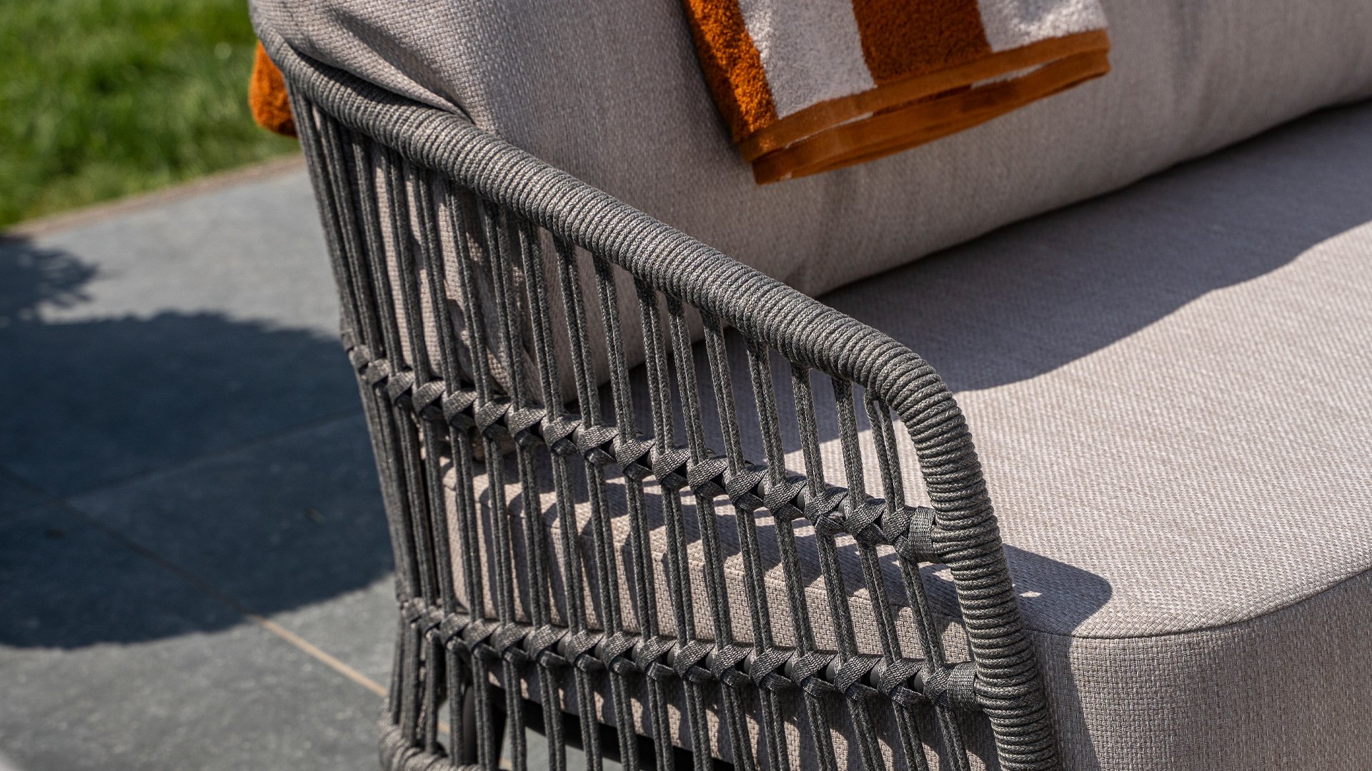 Materialien von höchster Qualität: ein robustes Rope- und Aluminiumgestell, kombiniert mit langlebigen Allwetterkissen, die jeder Saison mühelos standhalten.