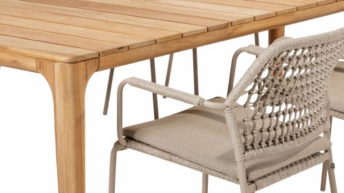Gartenmöbel aus Teakholz bieten einen atemberaubenden Blick.Teakholz eignet sich besonders gut für den Einsatz im Außenbereich. Es ist resistent gegen Schädlinge und Pilze und widerstandsfähig gegen Sonne, Regen und Schnee. Mit der Zeit entwickelt das Teakholz eine silbergraue Patina. Gartenmöbel aus Teakholz bieten einen atemberaubenden Blick. Darüber hinaus ist es starkes Material und erfordert nur wenig Wartung. Wer die ursprüngliche Farbe des Teakholzes bevorzugt, kann durch regelmäßiges benutzen unser Pflegemittel ganz einfach das Vergrauen des Holzes verhindern.Darüber hinaus können Sie Teak mit grüner Seife reinigen. Durch Temperaturunterschiede und durch den Wechsel von Feuchtigkeit und Trockenheit können kleine Haarrisse entstehen. Es ist üblich, dass Man in dies Unvollkommenheiten findet, diese Unregelmäßigkeiten sind kennzeichnend für dieses Produkt. Diese Unregelmäßigkeiten können nie einen Anlass zu Reklamation, Garantie oder Claim formen. Es betrifft eine Unterschrift von Originalität! Wir gewähren Garantie auf alle Produktions- und Konstruktionsfehler. Die Wirkung von Teakholz ist nicht enthalten. Wenn Sie sich für Teakholz entscheiden, erwarten wir, dass Sie diese Eigenschaften zu schätzen wissen. Eventuell auftretende Haarrisse, Äste im Teakholz und raue Oberflächen im Laufe der Zeit fallen nicht unter unsere Garantie. Diese Eigenschaften verleihen dem Teakholz seinen eigenen Charakter und sind Teil der Optik. Seien Sie vorsichtig mit einem Blumentopf oder einer Vase auf Ihrem Gartentisch aus Teakholz, da dies zu hartnäckigen Kreisen oder Farbunterschieden führen kann.