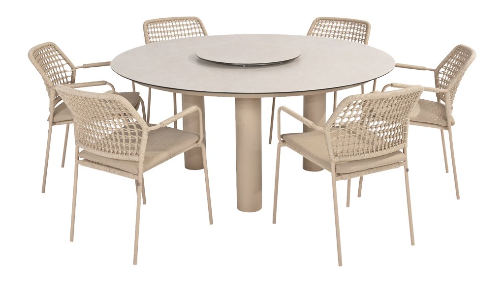 Der Donato Tisch ist mit einem Durchmesser von 160 cm eine tolle Ergänzung für jeden Essbereich und eignet sich ideal für gesellige Runden. Das Besondere an diesem Tisch ist die Gestaltung seiner Beine: Mit insgesamt drei dreieckig angeordneten Beinen bietet er nicht nur Stabilität, sondern auch eine markante, verspielte Optik. Die Keramik-Glas-Tischplatte verleiht ihm eine luxuriöse Ausstrahlung und ist gleichzeitig pflegeleicht. In der Taste by 4 Seasons Outdoor Donato-Serie gibt es einige Möglichkeiten, so ist er als Esstisch in den Farben erhältlich: Taste 4Seasons Donato Tisch Ø160cm Latte & Taste 4Seasons Donato Tisch Ø160 cm Terre, was es Ihnen ermöglicht, das perfekte Match für Ihr Interieur zu wählen. Um die Mayonnaise oder die Milch an die Person gegenüber zu reichen, fügen Sie einfach den: Taste 4Seasons Donato Lazy Susan dem Ganzen hinzu. Außerdem ist auch eine Low-Dining-Variante in der Farben Latte & Terre erhältlich, ideal für ein informelles und entspanntes Speiseerlebnis: Taste 4Seasons Donato Low Dining Tisch Ø160cm Latte, Taste 4Seasons Donato Low-Dining Tisch Ø160 cm Terre. Was gibt es noch?