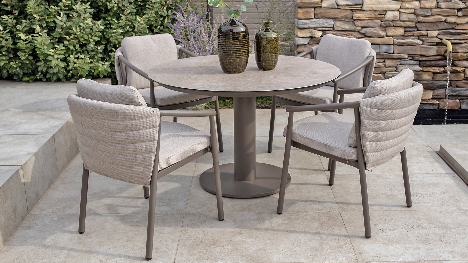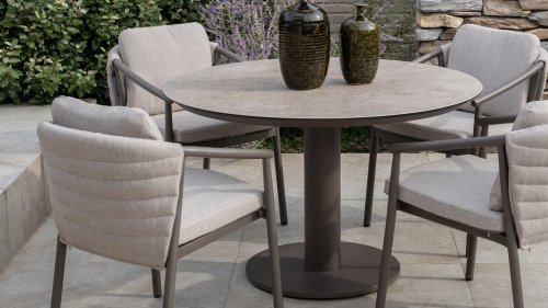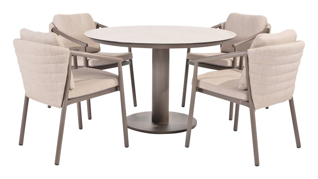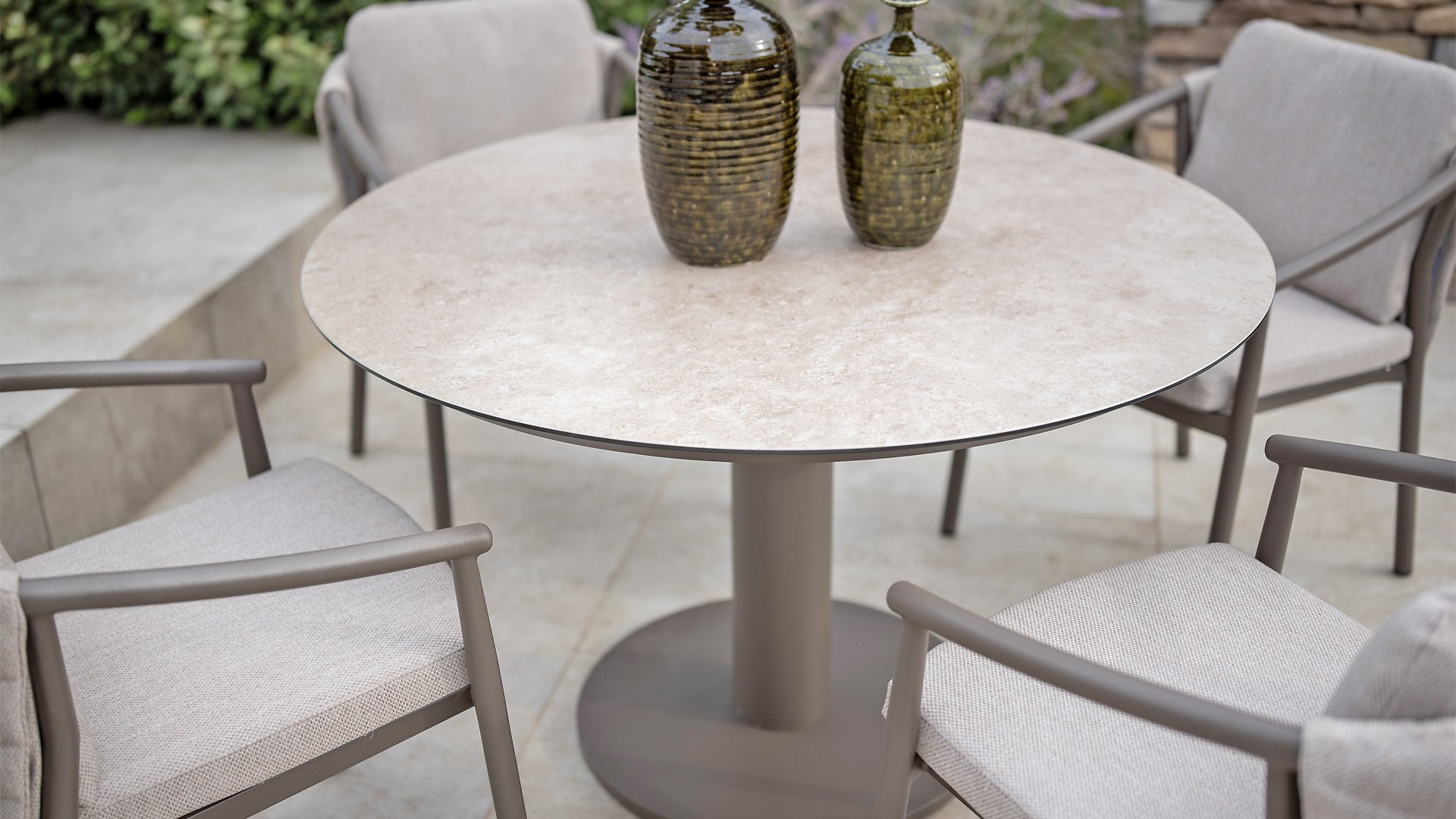 Lernen Sie Taste Sarah kennen, den runden Tisch, der Eleganz und Funktionalität mühelos vereint. Dieser schöne Tisch ist ein echter Hingucker in jedem Garten oder Essbereich. Sein rundes Design schafft eine gemütliche, einladende Atmosphäre, in der alle am Tisch in Kontakt bleiben. Die hochwertig bedruckte Keramikplatte sorgt nicht nur für eine luxuriöse Optik, sondern ist auch außergewöhnlich robust, kratzfest und pflegeleicht. Das zentrale Bein bietet maximale Beinfreiheit und verleiht dem Tisch einen modernen, luftigen Look. Taste by 4 Seasons Outdoor Sarah ist in zwei Ausführungen und zwei Farben erhältlich. Der Tisch ist in zwei Größen erhältlich: 120x75cm (Dining) und 130x69cm (Low Dining) in den Farben Latte und Terre. Entdecken Sie sie unten: