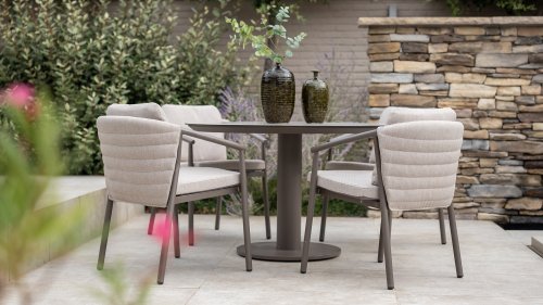 Der Taste 4SO Barolo ist einzigartig. Die gesteppte Rückenlehne verleiht dem Stuhl eine besondere Note und bietet wunderbar weichen Sitzkomfort. In Kombination mit dem eleganten, pulverbeschichteten Aluminiumgestell in Terre-Optik und dem stilvollen grauen Seil, das die Kissen umgibt, schafft der Stuhl eine ruhige und stilvolle Optik, die perfekt in jeden modernen Garten passt. Die hellgrauen Kissen runden das Gesamtbild ab und laden zu langen, gemütlichen Abenden im Freien ein. Neben dem Gartenmöbelset ist in dieser Serie auch ein Lounge-Set erhältlich, um das Outdoor-Erlebnis abzurunden.