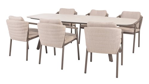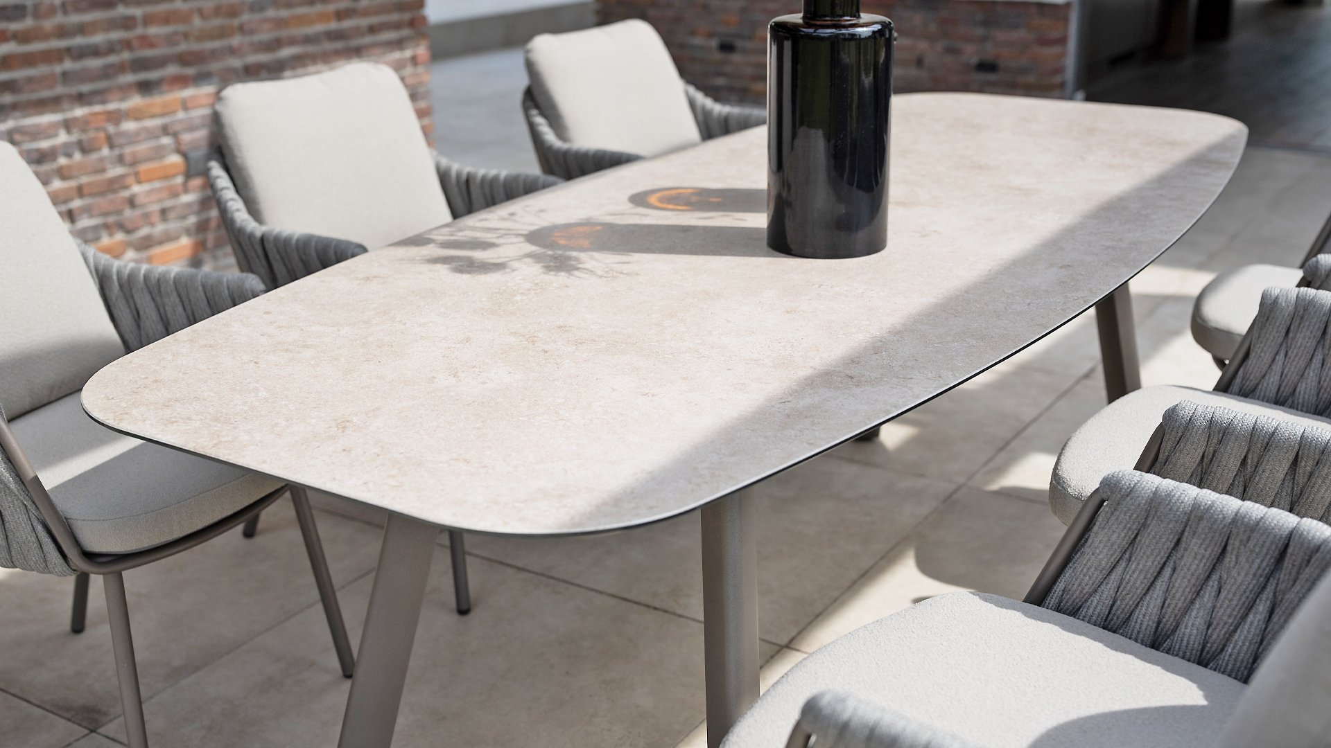 Der Taste 4SO Barolo ist einzigartig. Die gesteppte Rückenlehne verleiht dem Stuhl eine besondere Note und bietet wunderbar weichen Sitzkomfort. In Kombination mit dem eleganten, pulverbeschichteten Aluminiumgestell in Terre-Optik und dem stilvollen grauen Seil, das die Kissen umgibt, schafft der Stuhl eine ruhige und stilvolle Optik, die perfekt in jeden modernen Garten passt. Die hellgrauen Kissen runden das Gesamtbild ab und laden zu langen, gemütlichen Abenden im Freien ein. Neben dem Gartenmöbelset ist in dieser Serie auch ein Lounge-Set erhältlich, um das Outdoor-Erlebnis abzurunden.