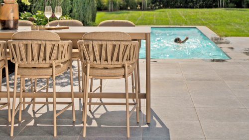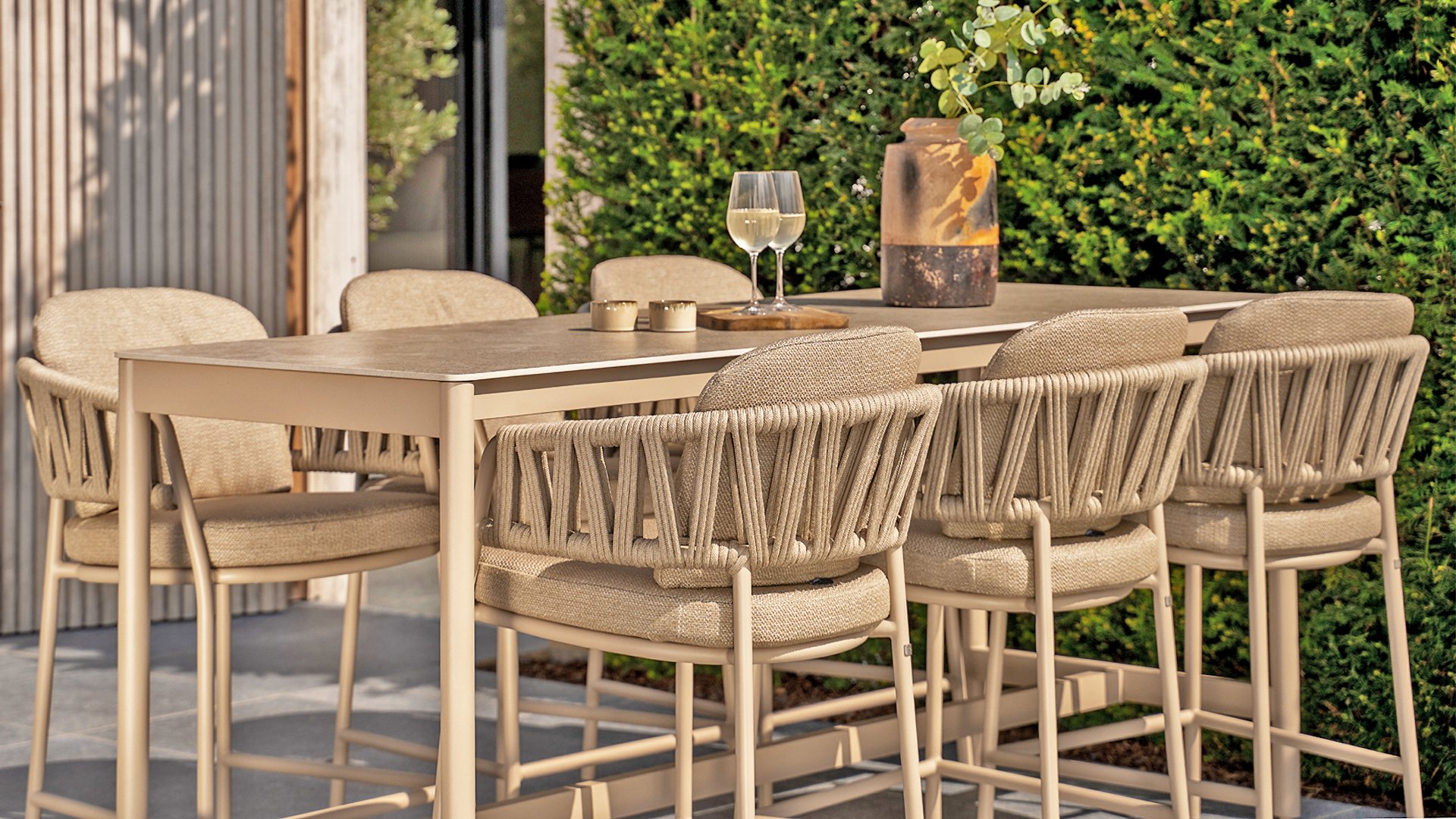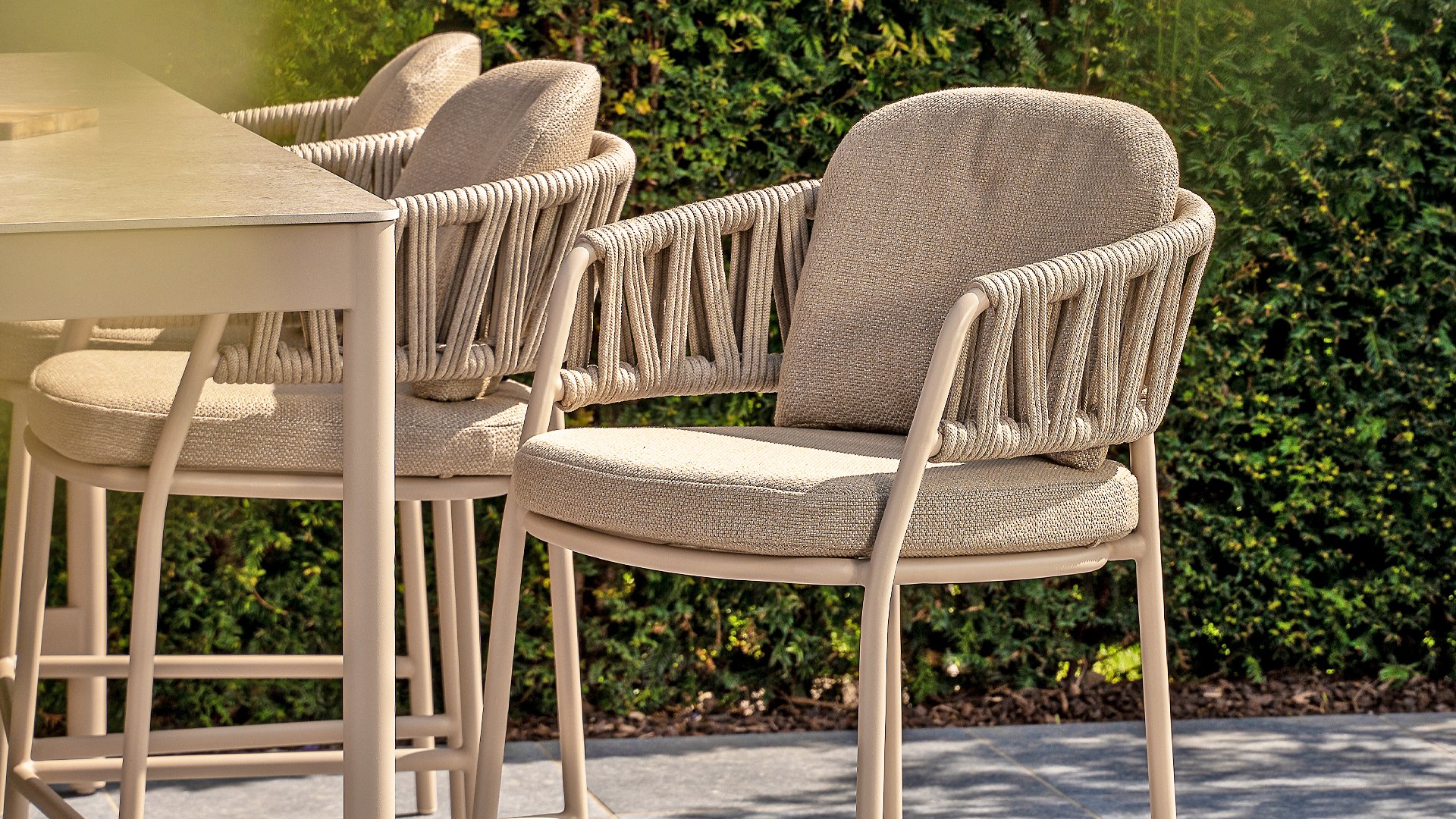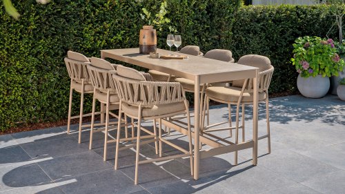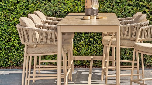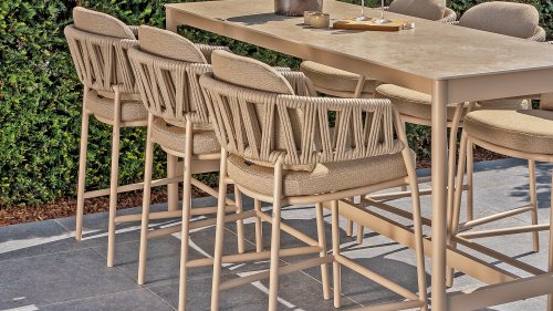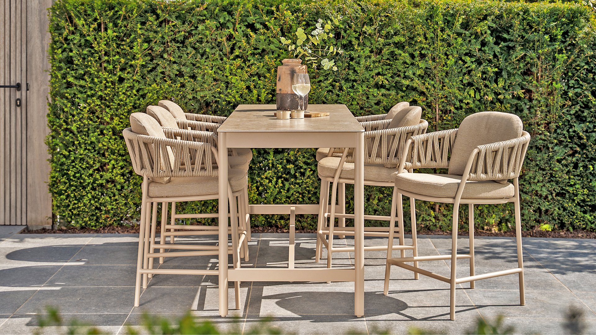 Erleben Sie luxuriöses Wohnen im Freien: Der Calma Hochstuhl von Taste by 4 Seasons Outdoor – Verschönern Sie Ihren Außenbereich mit dem Calma Hochstuhl von Taste by 4 Seasons Outdoor. Dieser Stuhl ist mehr als nur ein Stuhl; er ist ein Statement zeitgenössischen Designs und bietet höchsten Sitzkomfort, der perfekt zum modernen Lebensstil passt. Als Herzstück der exklusiven Taste by 4 Seasons Outdoor Kollektion vereint der Calma den vertrauten Komfort eines traditionellen Esszimmerstuhls mit der modernen Eleganz eines Barhockers. Speziell für erhöhte Essbereiche konzipiert, schafft dieser Stuhl eine dynamische und gesellige Atmosphäre auf jeder Terrasse, jedem Balkon oder jeder Veranda. Ideal für lange Sommerabende, gemütliche Drinks oder ein entspanntes Essen in der Sonne.