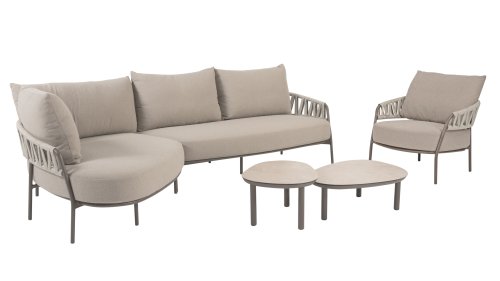 Verleihen Sie Ihrem Garten oder Ihrer Terrasse mit dem Calma Lounge-Set der niederländischen Qualitätsmarke Taste by 4 Seasons Ruhe und Stil. Der Name Calma spiegelt perfekt das Gefühl wider, das dieses Set vermittelt: Entspannung, Komfort und Harmonie. Das Terre-farbene Aluminiumgestell in Kombination mit der graufarbenen Seilstruktur( Rope)  an Rückenlehne und Seitenwänden schafft einen warmen und modernen Look und verwandelt Ihren Garten in eine wahre Wohlfühloase. Das Calma Lounge-Set bietet hervorragenden Sitzkomfort, ideal für lange Sommerabende, entspannte Momente mit einem Buch oder gemütliche Treffen mit Familie und Freunden. Zusätzlich zum Lounge-Set ist die Calma-Serie auch mit einem passenden Calma Esszimmerstuhl erhältlich, sodass Sie Ihren gesamten Außenbereich einheitlich gestalten können. Mit dem Calma Lounge-Set vereinen Sie Stil, Komfort und Langlebigkeit. Das taupefarbene Seil und das Latte-farbene Gestell ergeben zusammen eine ruhige, natürliche Farbkombination, die perfekt zum Namen Calma passt. Schaffen Sie sich Ihr eigenes Outdoor-Paradies und genießen Sie jeden Moment in höchstem Komfort.