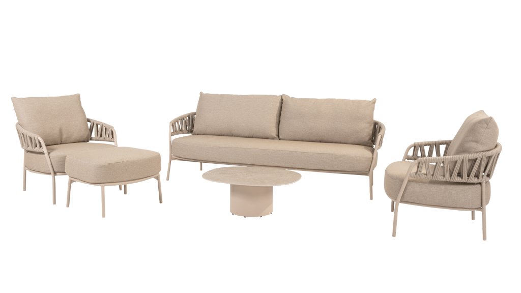 Mit dem Calma Lounge-Set vereinen Sie Stil, Komfort und Langlebigkeit. Taupefarbenes Seil und ein Latte-farbenes Gestell ergeben eine ruhige, natürliche Farbkombination, die perfekt zum Namen Calma passt. Schaffen Sie sich Ihre eigene Outdoor-Oase und genießen Sie jeden Moment in höchstem Komfort.