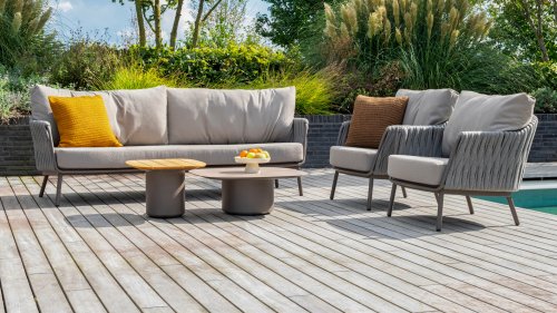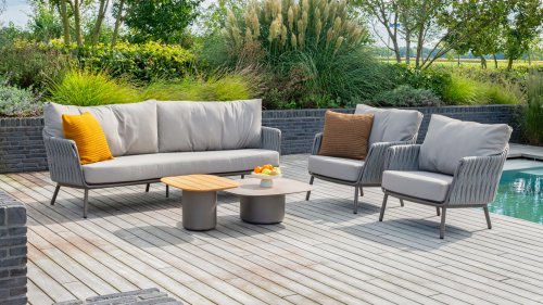 Erleben Sie den Komfort von Cannes. Diese Kollektion lädt Sie ein, stilvoll zu entspannen, mit dem wunderschön geflochtenen Seildesign und den bequemen Kissen. Ob Sie sich für das niedrige Ess-Set entscheiden oder die entspannende Lounge-Variante bevorzugen – Cannes bringt ultimativen Komfort und Eleganz auf Ihre Terrasse oder Ihren Patio. Die perfekte Wahl für lange Sommertage.