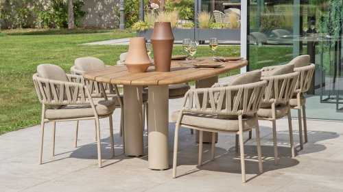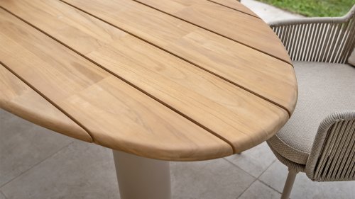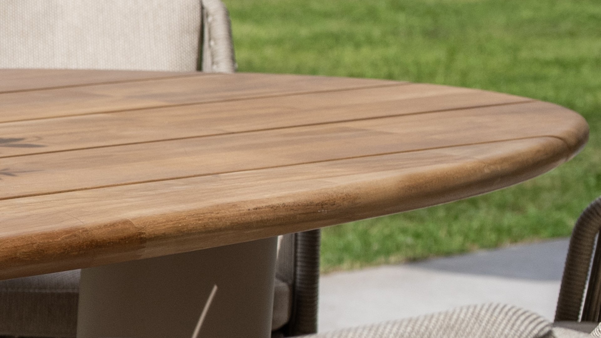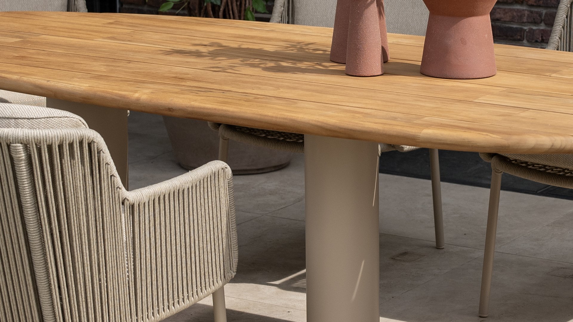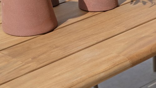 Der Estate ist mit einer Keramik- und Teakholzplatte erhältlich. Und das ist noch nicht alles: Er ist außerdem in zwei Farben erhältlich, darunter Latte und Amber. Sie bevorzugen einen pflegeleichten Tisch? Dann ist die Keramikvariante die bessere Wahl. Sie bevorzugen eine natürlichere Note? Dann ist die Teakholzplatte die bessere Wahl. Das robuste Untergestell besteht aus pulverbeschichtetem Aluminium. Das Dreibeingestell mit drei geraden Säulen verleiht dem Tisch eine moderne und stabile Basis. Sehen Sie sich die Tische unten an: