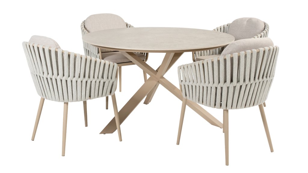 Leidenschaft für Eva Entworfen mit Liebe zum Detail. Die dickem, weichen Seilbänder folgen der schönen organischen Form des Rahmens. Dazu kommen die herrlich bequemen Kissen hinzu und du verstehst, warum wir so begeistert sind von der Taste by 4 Seasons Outdoor Eva Lounge- & Diningset. Der Taste 4SO Eva Dining Stuhl hat ein modernes Design. Der Stuhl wird mit weichen Kissen geliefert und verfügt über einen zeitgemäßen, Aluminium-Rahmen mit passender, latte Seilpolsterung. Das dicke Seil passt gut zum lattefarbenen Rahmen und sorgt zusammen mit den Kissen für einen bequemen Sitzkomfort. Eine Farbe, die am besten als geschmackvolles Beige beschrieben werden kann.