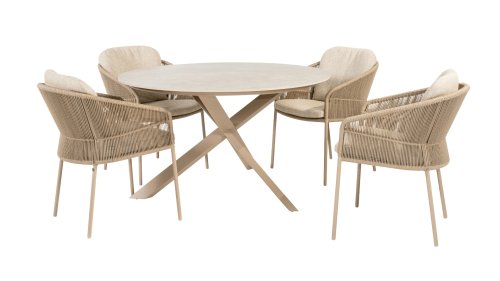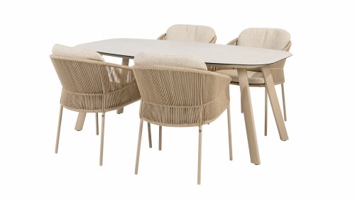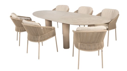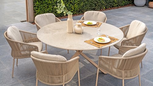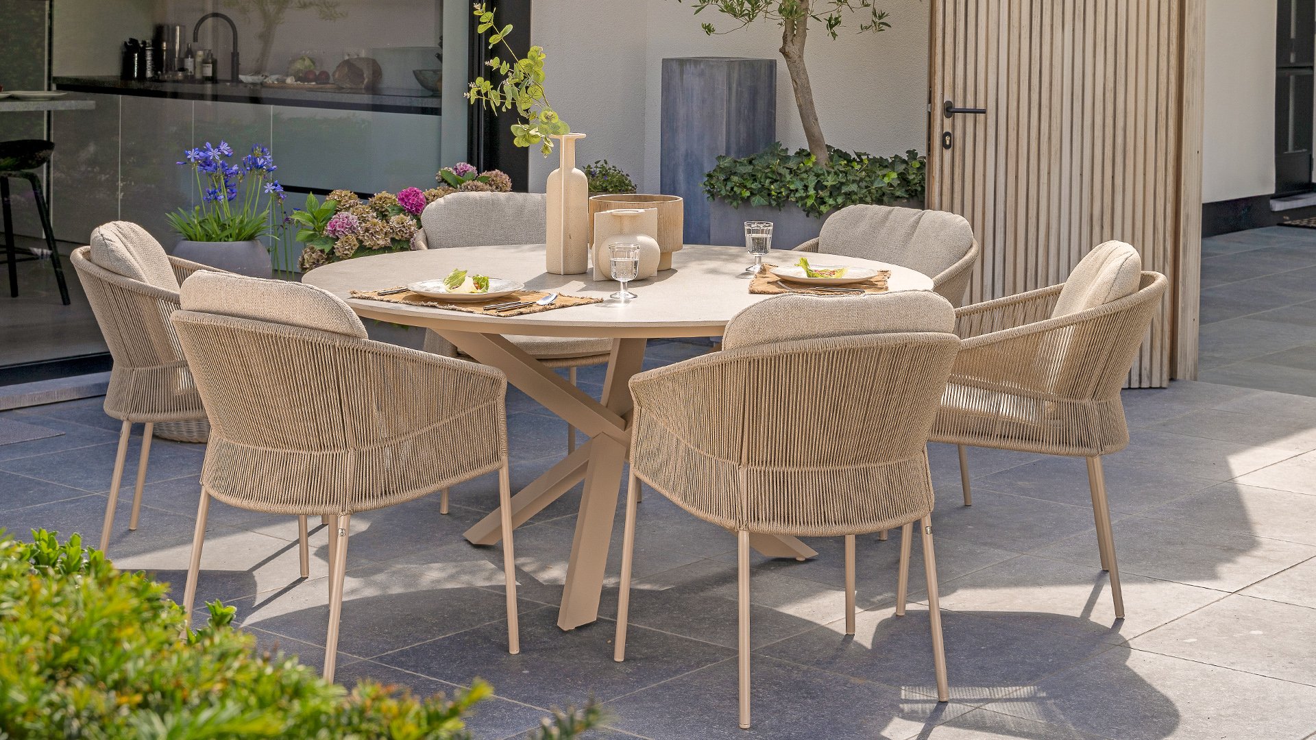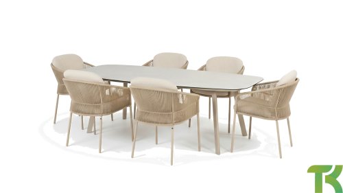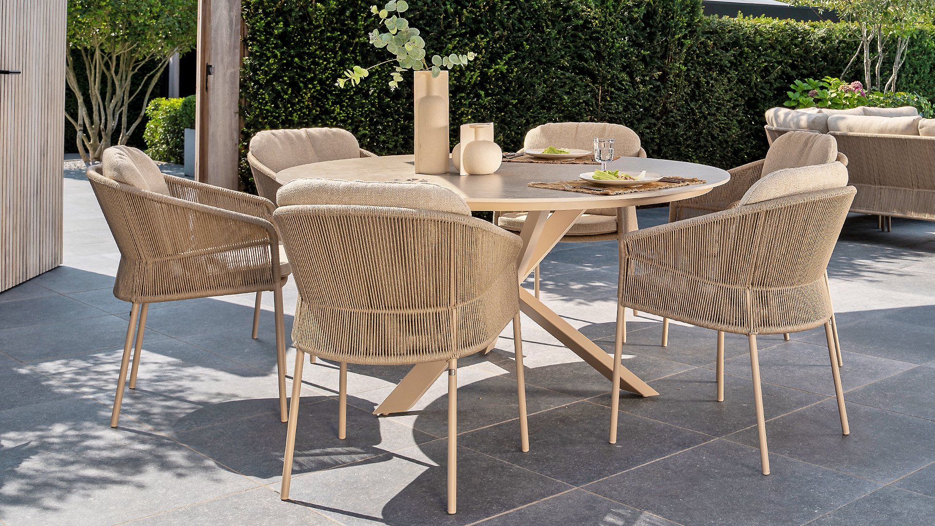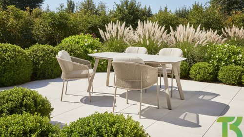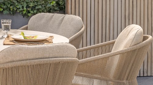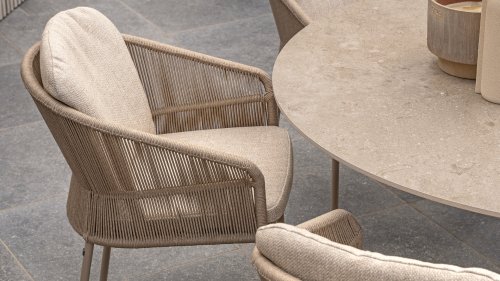 Inspiriert vom zeitlosen Charme Italiens zeichnet sich Florence durch sein dicht gewebtes Seilmuster und die raffinierte Trennung zwischen Rückenlehne und Sitzfläche aus, die einen modernen und eleganten Effekt erzeugen. Die bequemen Kissen bieten hervorragenden Sitzkomfort und machen dieses Esszimmerset perfekt für lange, entspannte Momente im Freien. Erhältlich in zwei eleganten Farben: Taste Florence Dining Terre – ein warmer, erdiger Farbton, der perfekt zu natürlichen Gartenelementen passt. Taste Florence Dining Latte – eine helle, elegante Farbe für einen frischen, sommerlichen Look.