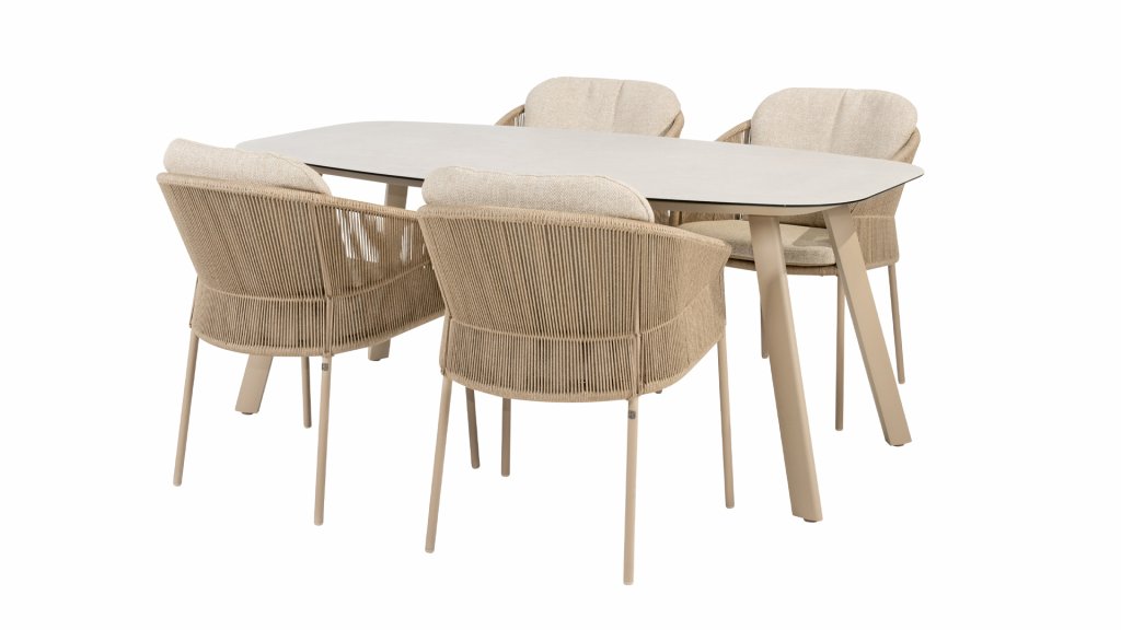 Suchen Sie einen pflegeleichten Tisch mit modernem Look? Dann ist der Taste by 4 Seasons Outdoor Manolo 180 cm genau das Richtige für Sie. Erhältlich in den Farben Anthrazit, Latte und Terre. Die Form der Tischplatte und die Position der Aluminiumbeine machen diesen Tisch unglaublich praktisch. Diese Form schafft großzügigen Platz an allen Seiten. Das markante Design des Tisches zeichnet sich durch eine dänische ovale Tischplatte aus glasbedruckter Keramik aus, sodass er das ganze Jahr über im Freien stehen kann. Der Manolo ist auch in den Größen 75x75x75cm und 240x103x75cm in drei Farben erhältlich.